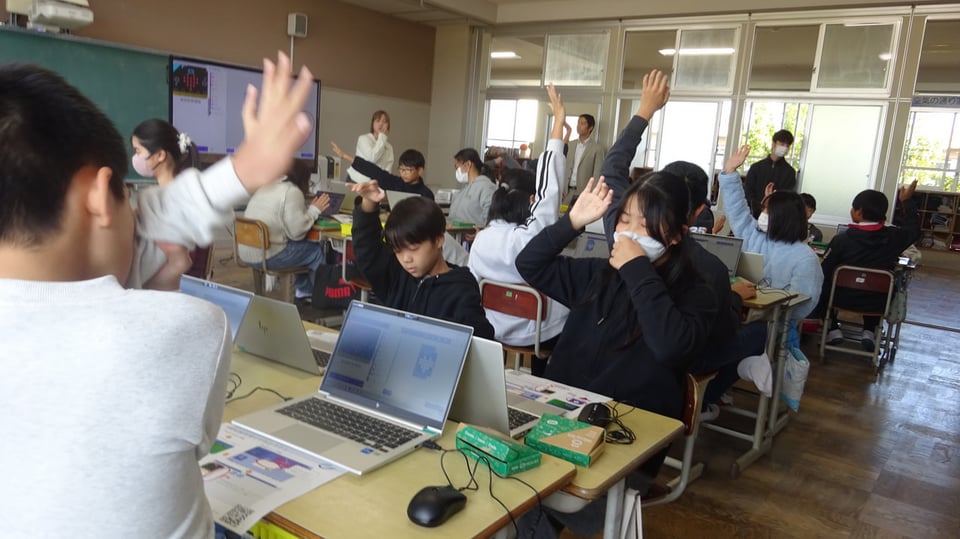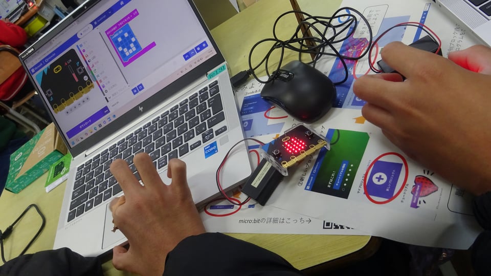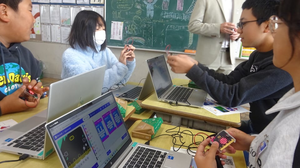 11月19日(木)2,3校時に6年教室で、宇部高専電気工学科の学生さんたちをお招きして、プログラミングの授業を行いました。LEDの点滅やスピーカーの音声をプログラムで制御する内容に楽しんでいる6年生でした。