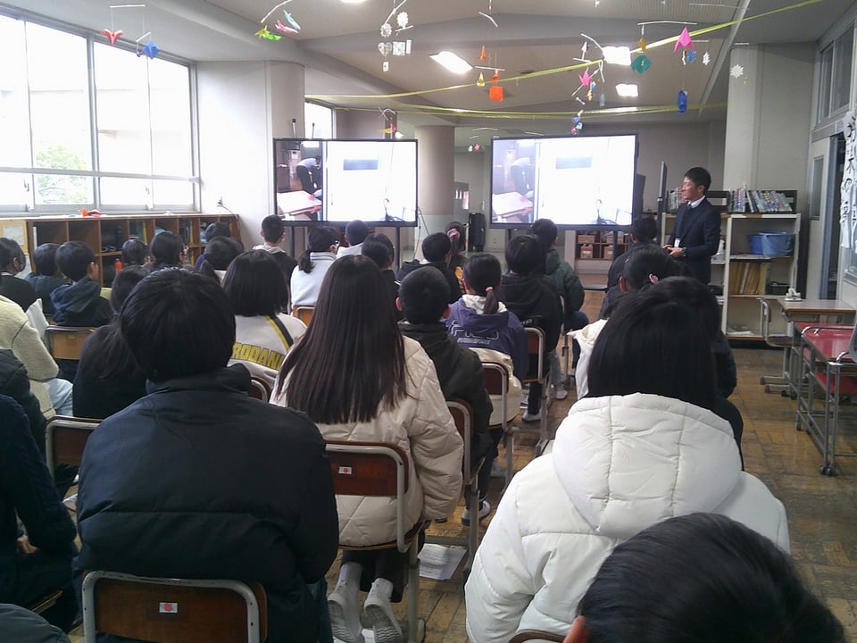 2月2日(月)6校時に6年オープンスペースで、上宇部中学校から先生を2人お招きして、中学進学に備えての説明を受けました。中学校の生活場面を写真で多く取り上げ、勉強や生活での心構えを教えていただきました。