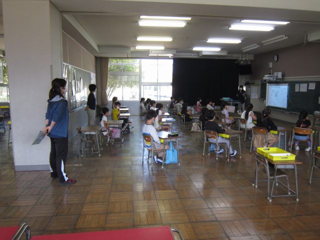 本校は、教室が全てオープンにできるという構造上の利点があるため、廊下側のスペースと合わせた広い空間を利用して、クラス単位の分散型登校を行いました。