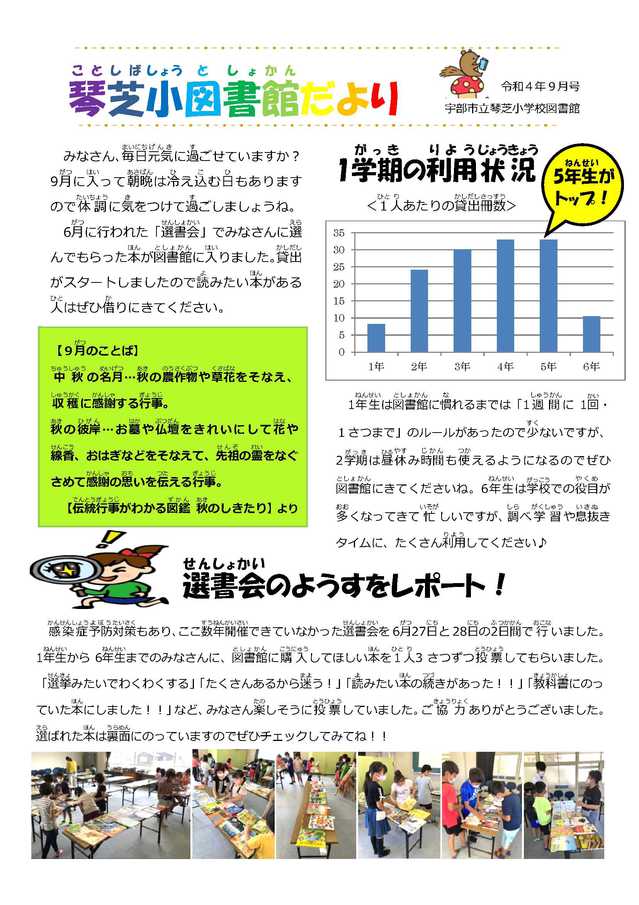 みなさん、毎日元気に 過ごせていますか?9 月に入って朝晩は冷え込む日もありますので 体調に気をつけて過ごしましょうね。6 月に行われた「 選書会」でみなさ ん に選んでもらった本が図書館に入りました。 貸出がスタートしましたので読みたい本がある人はぜひ借りにきてください。