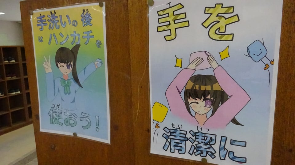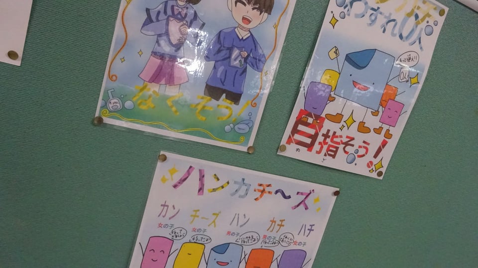 全校的にハンカチの携帯と手洗いの励行を、高学年の委員会活動で進めています。昇降口のげた箱や掲示板に保健体育委員会の子供たちが考えたキャラクターが貼ってあります。ともてがんばっていますので、ご家庭の方も、手洗い、ハンカチへのご協力をお願いいたします。