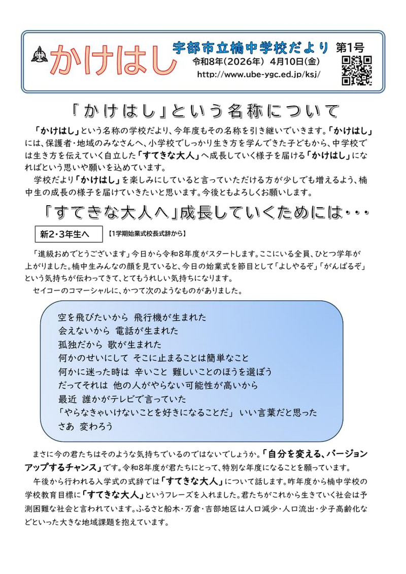 令和8年度の最初の学校だより「かけはし」第1号を掲載します。