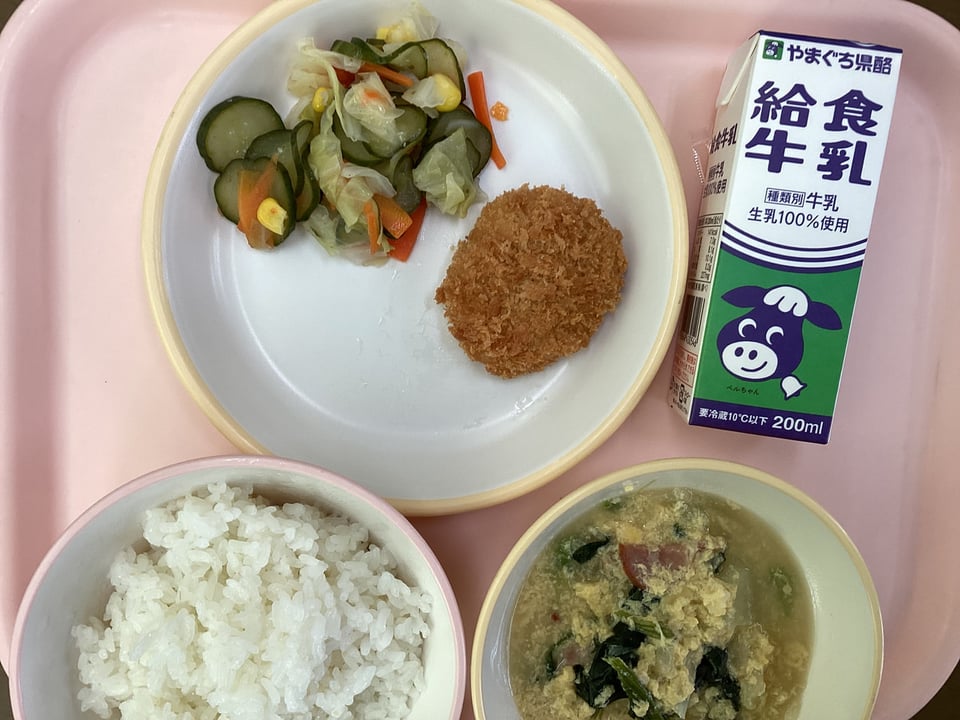 ・ふわふわスープ ・豆乳コロッケ ・キャベツときゅうりのサラダ ・ごはん ・牛乳