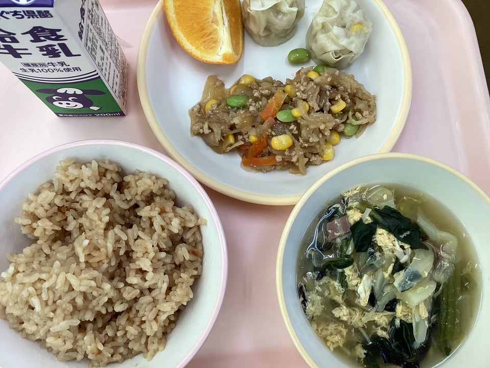 ・さくらごはん ・かきたまスープ ・シャキシャキそぼろ丼の具 ・コーンしゅうまい ・牛乳 ・オレンジ