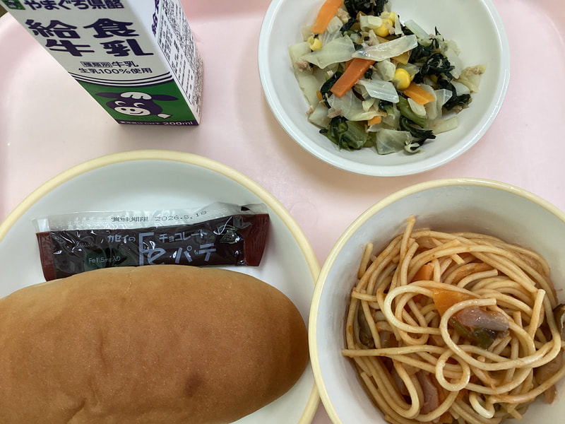 ・スパゲッティナポリタン ・小松菜ソテー ・パン ・パテチョコレート ・牛乳