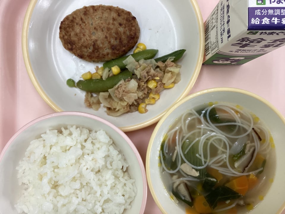 ・ハンバーグ ・ビーフンスープ ・スナップえんどうのソテツ ・ごはん ・牛乳