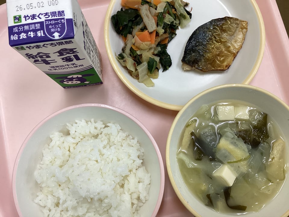 ・さばの塩焼き ・たまねぎのみそ汁 ・ほうれん草のおかか炒め ・ごはん ・牛乳