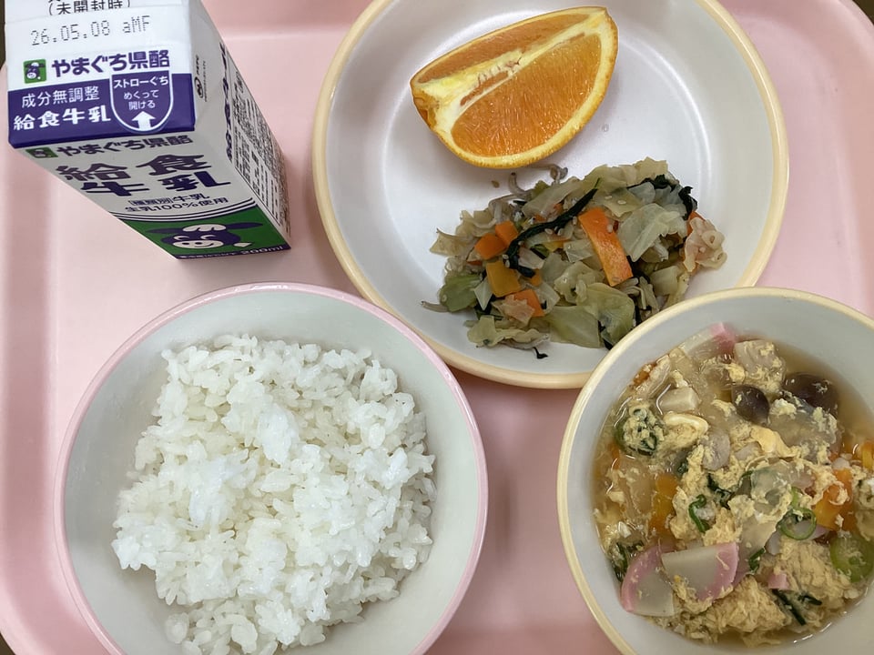 ・親子丼 ・野菜のごまじゃこ炒め ・ごはん ・牛乳 ・オレンジ