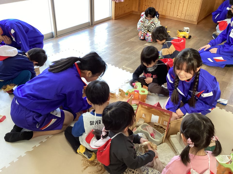卒園生の楠中生がとても多いようです。そんな思い入れのある船木保育園での園児のみなさんとのふれあいは3年生の心を癒やすすてきな時間となりました。3年生も園児も最初は遠慮がちでしたが、数分経てば打ち解けていました。園児たちにまぶりつかれている3年生の表情はとても穏やかで、優しい笑顔でした。受験等で気苦労が多かった3年生には束の間の休息となりました。「楽しかった」と多くの3年生がつぶやいていました。将来、保育士になりたいという志をもっている3年生もいると聞いています。すてきな気分転換となりました。楠保育園の先生方、園児のみなさん、お世話になりました。これからもよろしくお願いいたします。