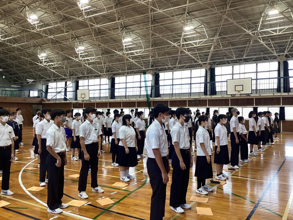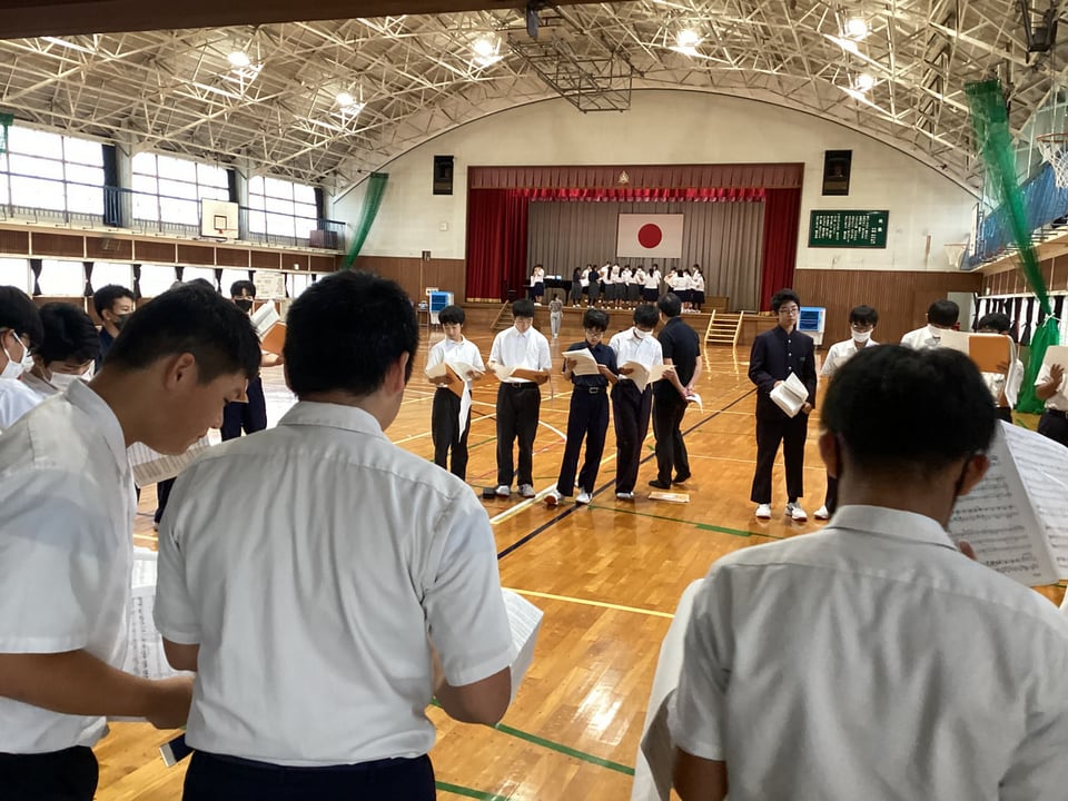 まずは全校生徒が体育館に集まり、今日のポイントの確認と発声練習です。