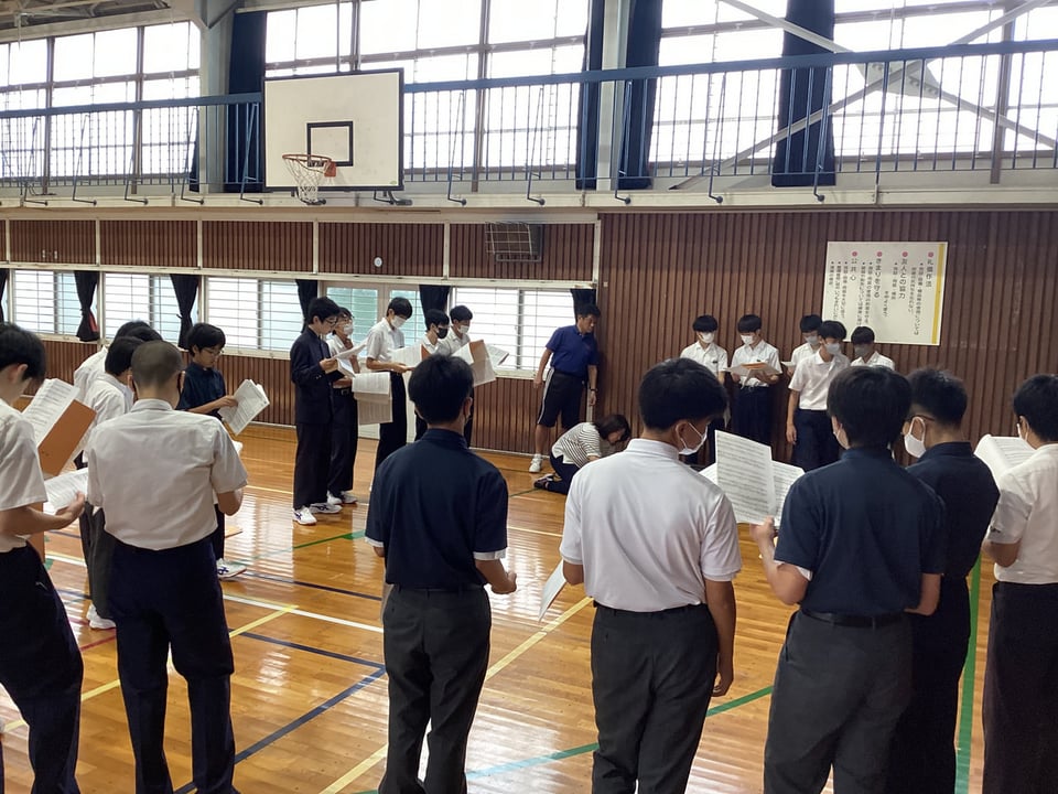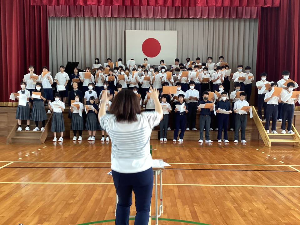 最後にもう一度体育館に集まり、全体で木村先生の指揮のもと、全体合唱を行いました。楠中生の気持ちがだんだんまとまってきている感じを受けました。