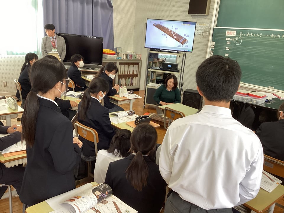 1年生は音楽の授業でした。「箏の奏法を知り、音を奏でてみよう」というねらいのもと授業が行われました。船木小がには箏クラブがあるため、馴染みのある楠中生もいました。箏は船木地区にとってはとてもゆかりのある楽器です。奏法するところは、見られませんでしたが、きっとがんばったと思います。