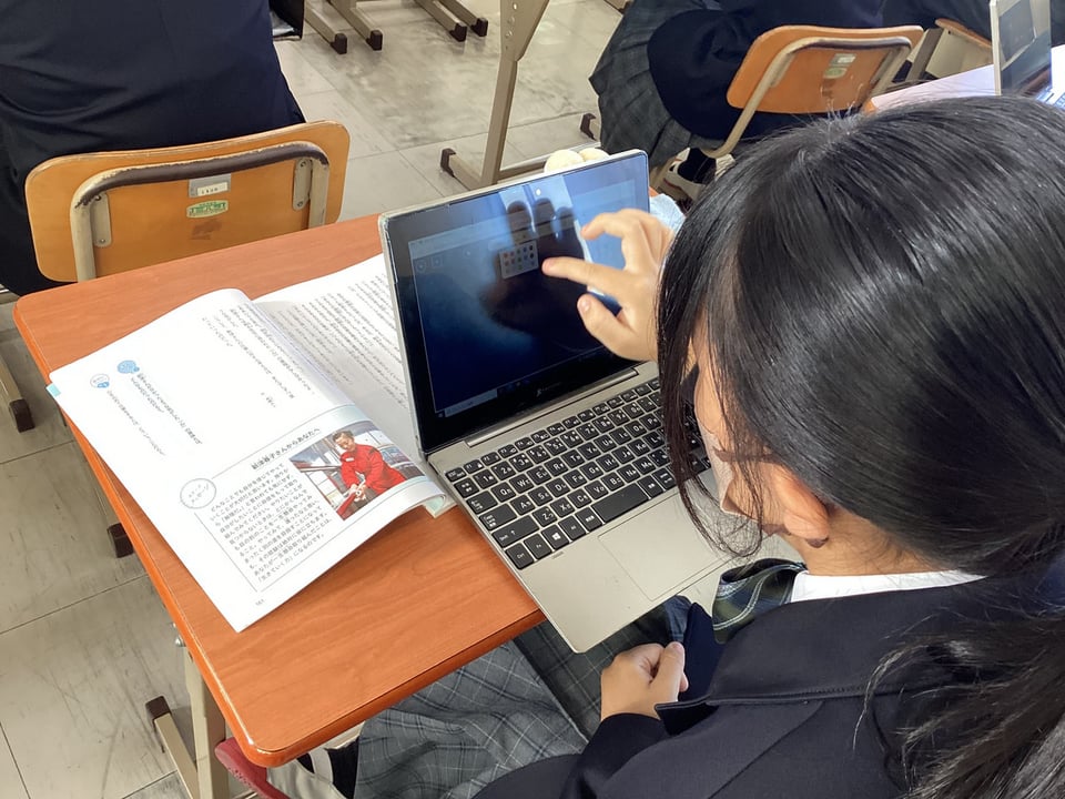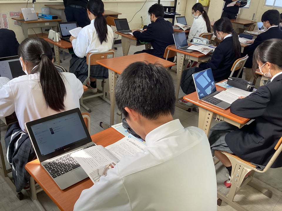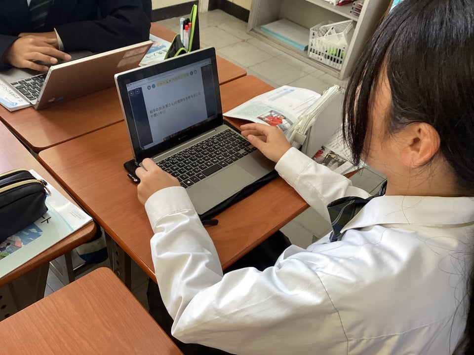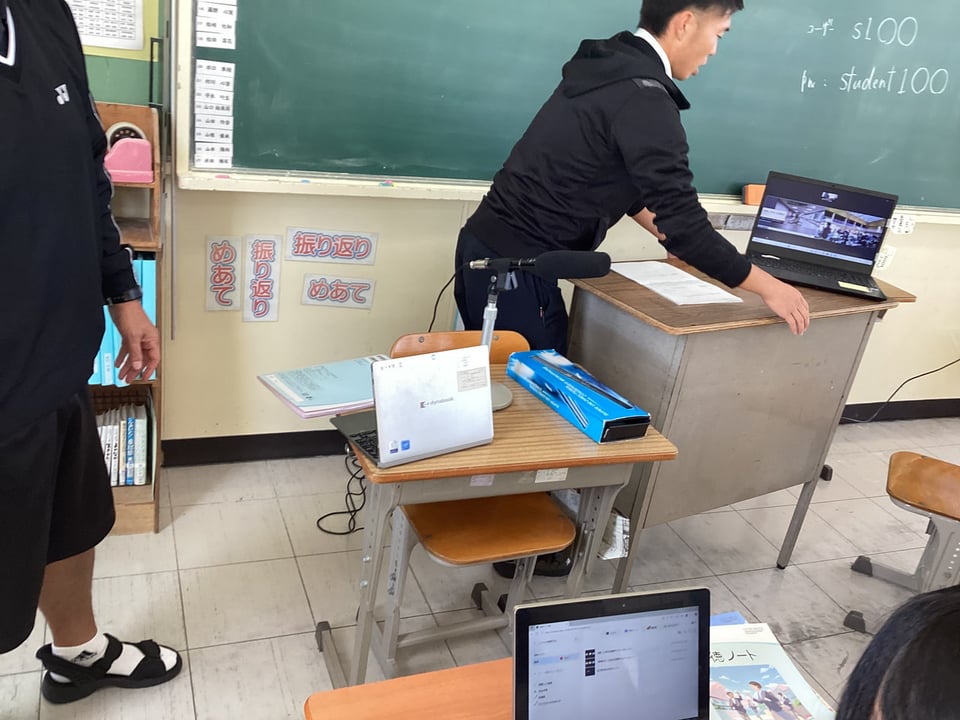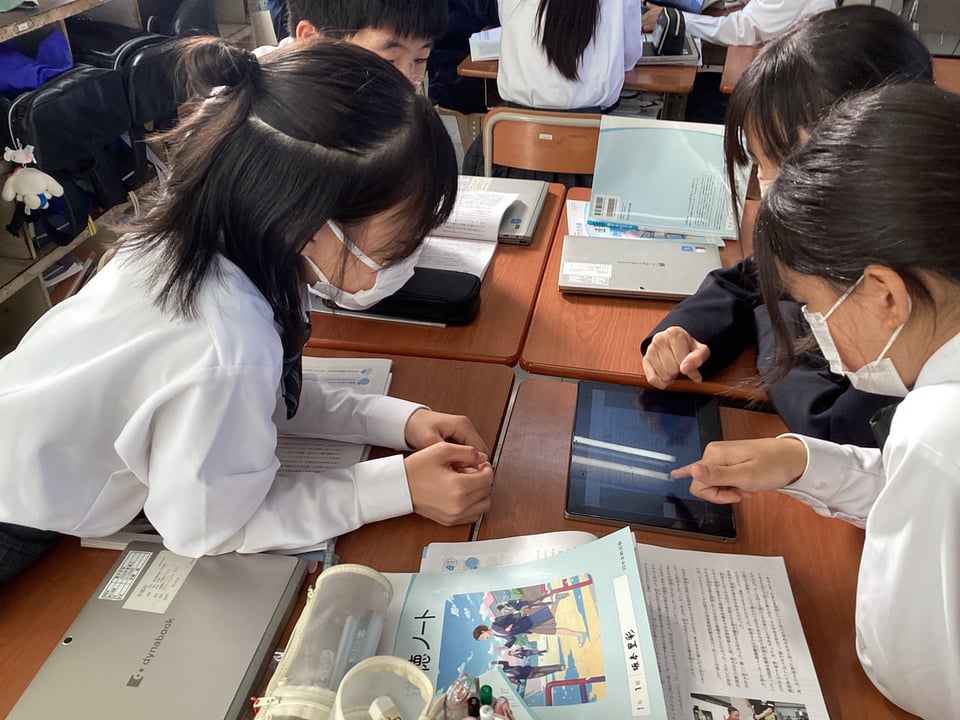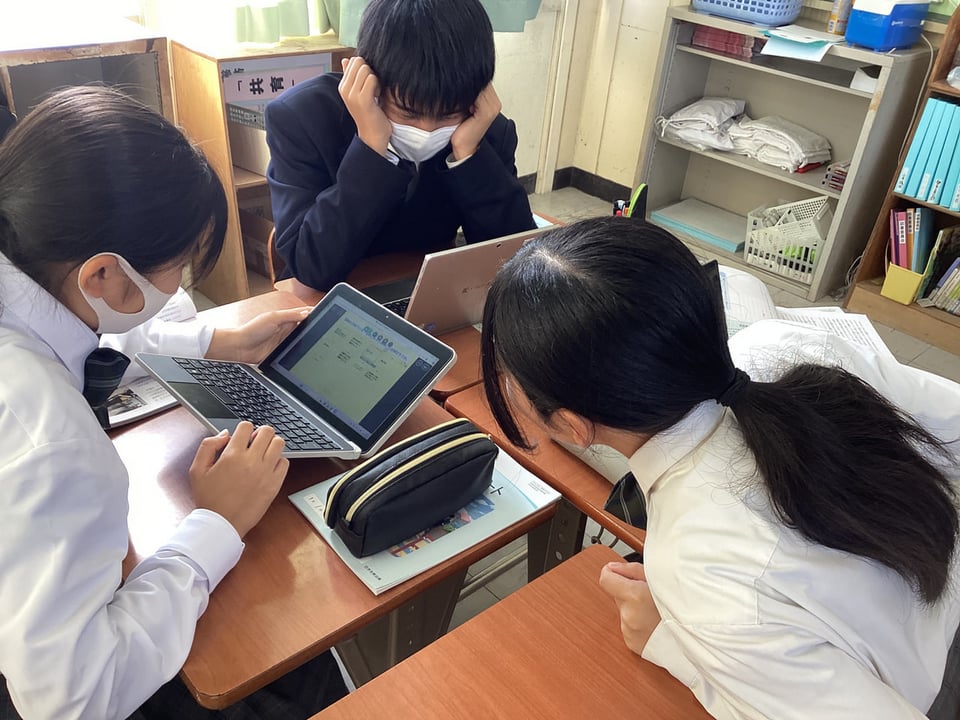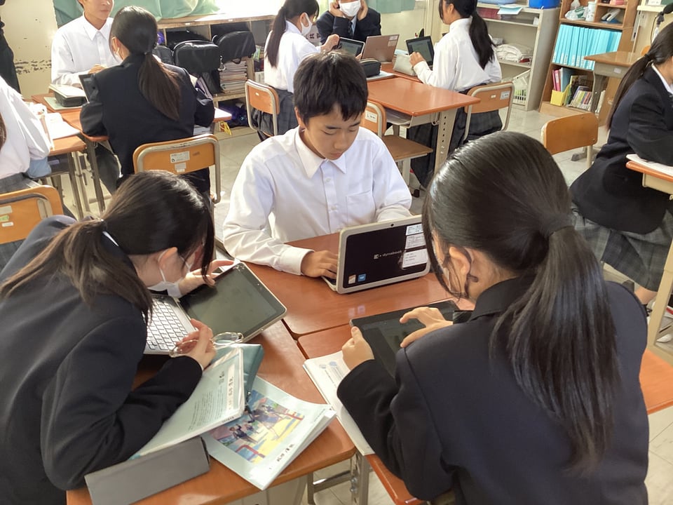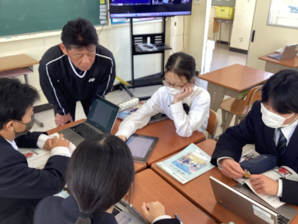 その後、クループになって意見をまとめました。そして、クループでまとめた意見を楠中は厚東川中の意見を、厚東川中は楠中の意見を確認し、気付きをロイロノートに提出しました。離れた場所で、授業を行いながら、意見交換がスムーズにできます。楠中生は「厚東川中の意見鋭い。思いつかなかった。」などの声をつぶやいていました。多くの人の意見を聴くことで、新たな発見があるものです。
