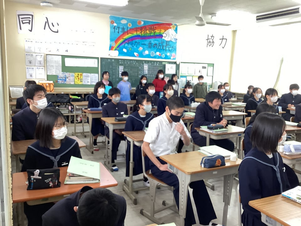 船木小6年生の目は輝いていました。楠中3年生が卒業するのは悲しいですが、現6年生新中学1年生となって楠中に入学してくるのは楽しみです。帰り際に「今日はありがとうございました」と校長にあいさつをする船木6年生、君たちはすてきです。楠中学校ですてきな大人へ成長していきましょう。やればできる!君たちならできる!