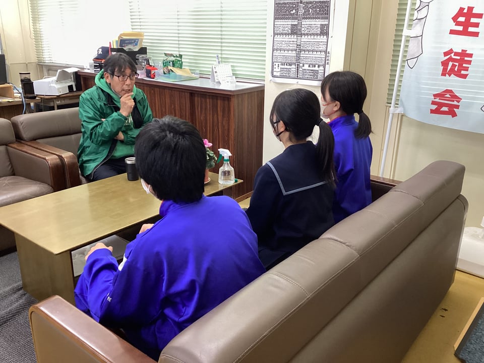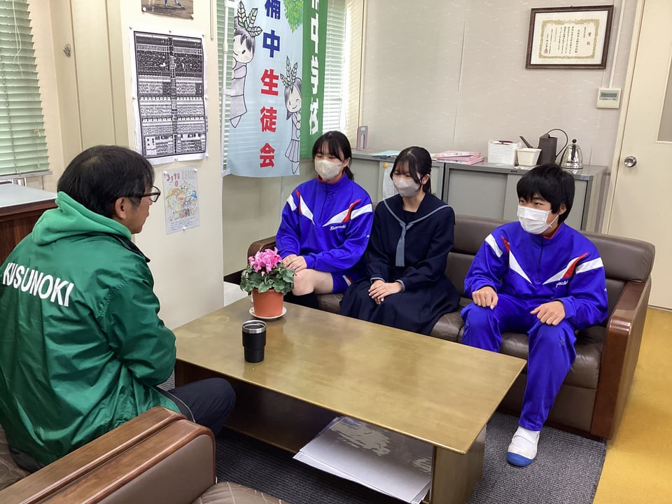 一人ひとりがこれからの決意、楠中学校をどうしていきたいかを語っていました。さすが楠中生が選んだ3名です。やる気と責任を果たす覚悟を感じとりました。校長からは学校生活はもちろんのこと、これからは楠中学校は地域貢献中学校をさらにめざしていきたい。「楠のまちは自分たちなしでは始まらない」この積極的な気持ちをもって、活動してほしいと注文しました。3人からは心強い返事をもらいました。新しい風が吹き始めています。さあ、みんなですてきな学校をつくっていきましょう。やればできる!君たちならできる!