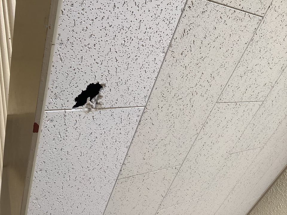 東側の階段で1階から2階に昇る途中の天井に穴が空いているのが発見されました。自分が関わっているという楠中生から報告があがってきていなかったので、全員で共有することにしました。