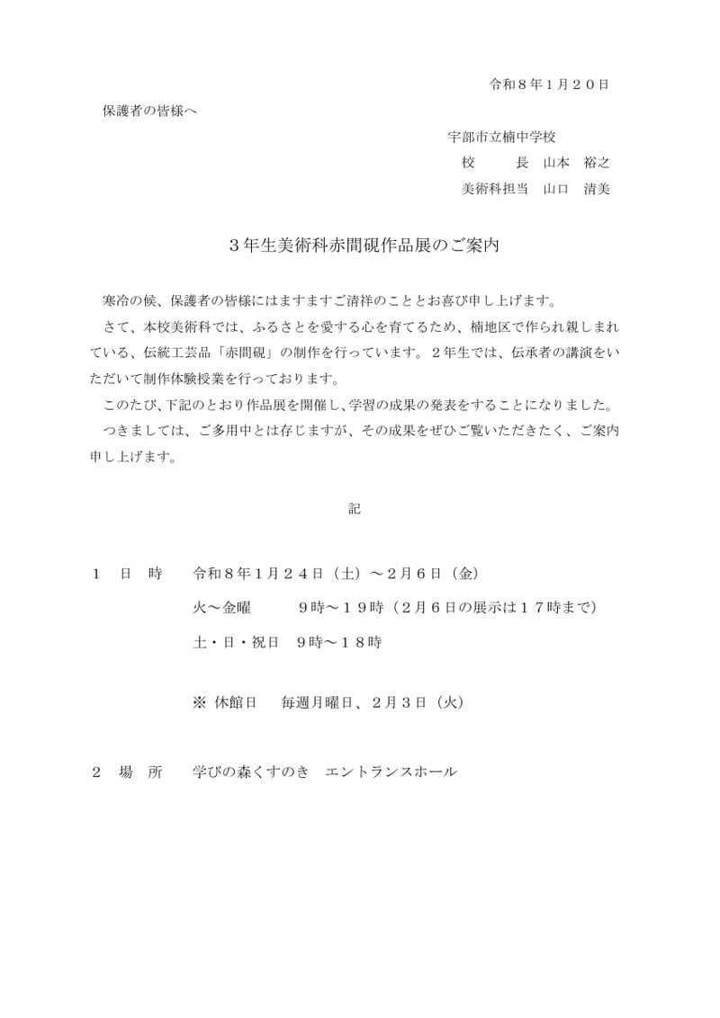 開催日時は令和8年1月24日(土)~2月6日(金) 休館日が毎週月曜日、2月3日(火)になります。火曜日~金曜日が9時~19時、土・日・祝日は9時~16時になります。「学びの森くすのき」エントランスホールです。是非、訪れていただき、ご覧いただけたらと思います。