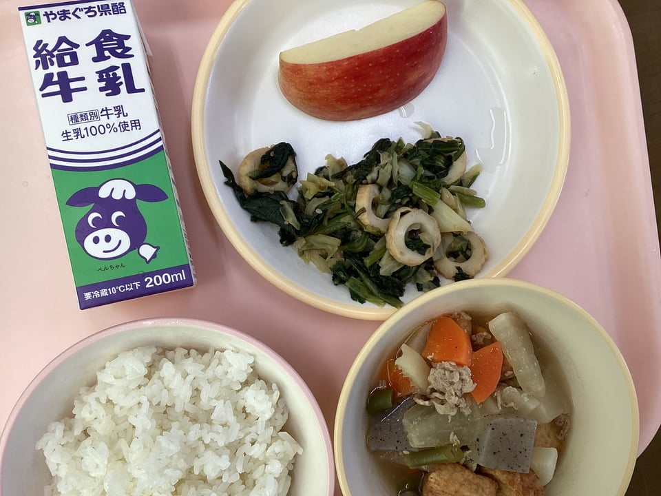 ・大根のみそ煮 ・野菜とちくわのごま炒め ・ごはん ・牛乳 ・みかん