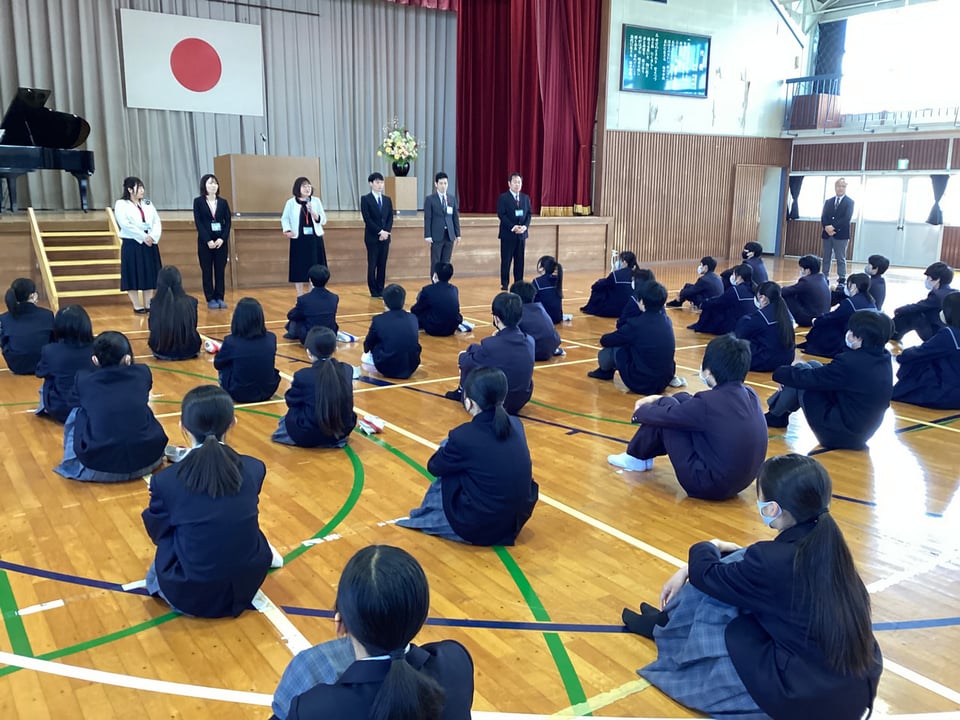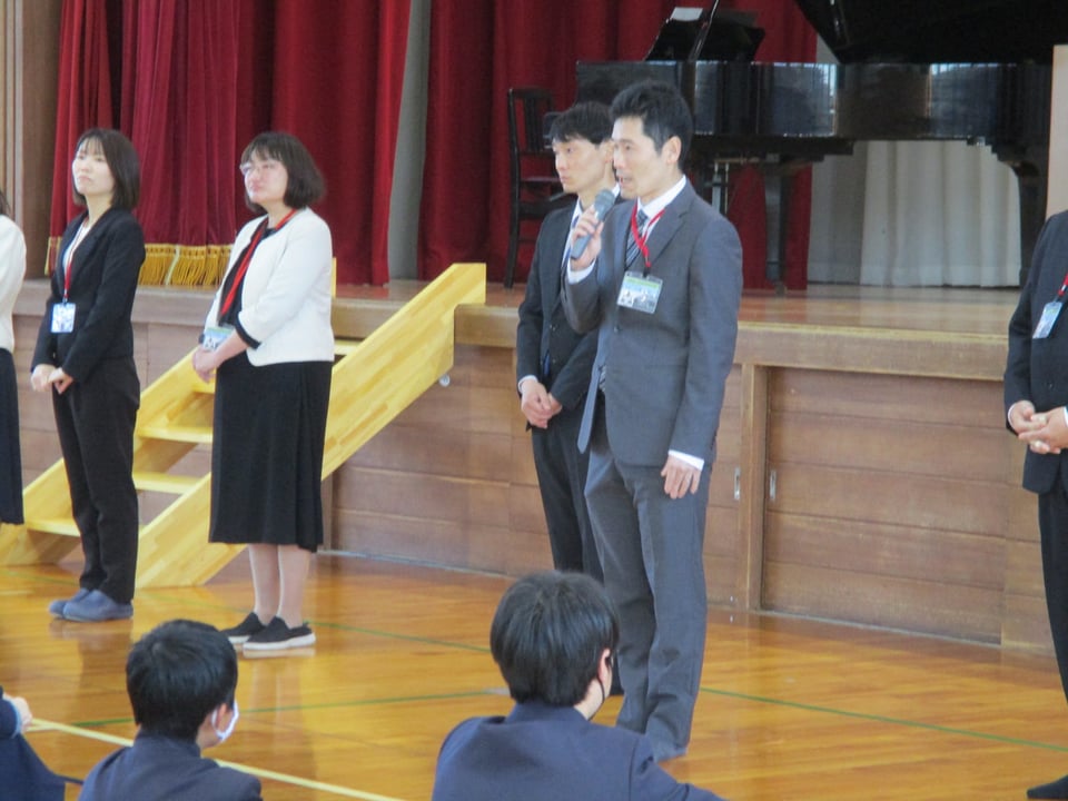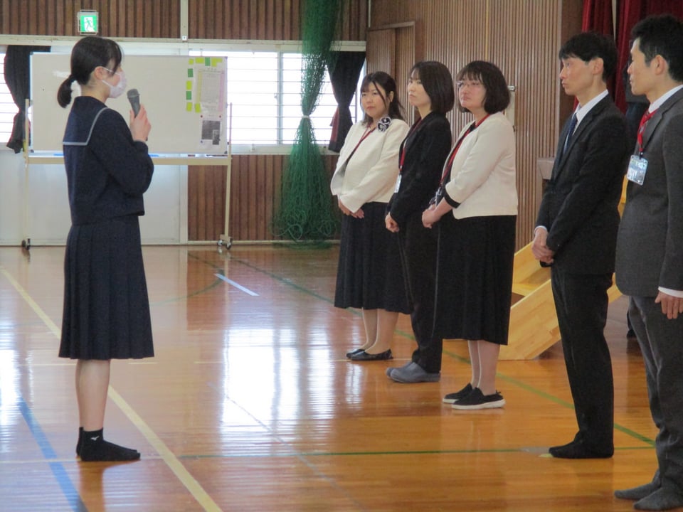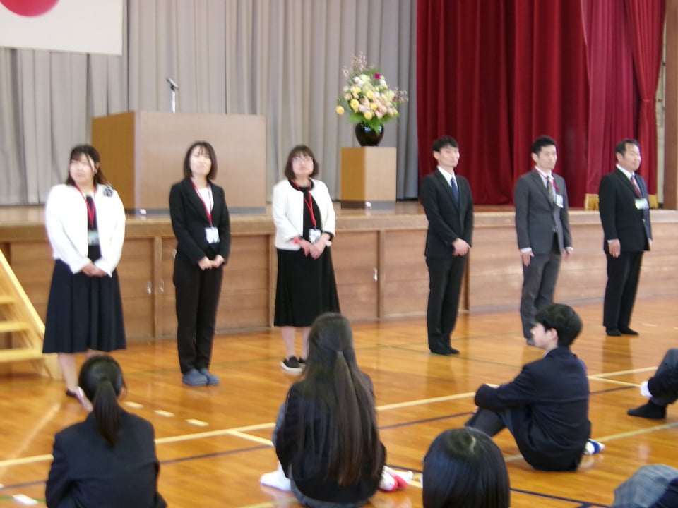 着任式では、この度の人事異動で新たに着任された7名の先生方と対面しました。生徒会長から楠中学校のことを「少人数の学校ではありますが、小規模校だからこそ、良さがあります。先生方もその良さをみつけてください」「楠中魂の言葉のもと、学校生活や勉学、行事などに全力で取り組んでいます。これから、多くの場面で先生方のお世話になりますが、ご指導よろしくお願いいたします」と歓迎の言葉がありました。着任された先生方、よろしくお願いいたします。