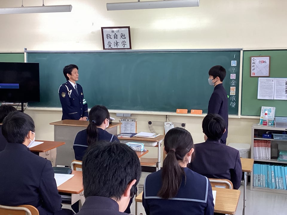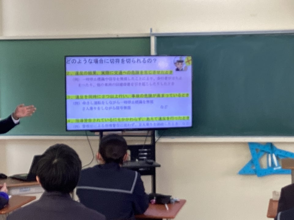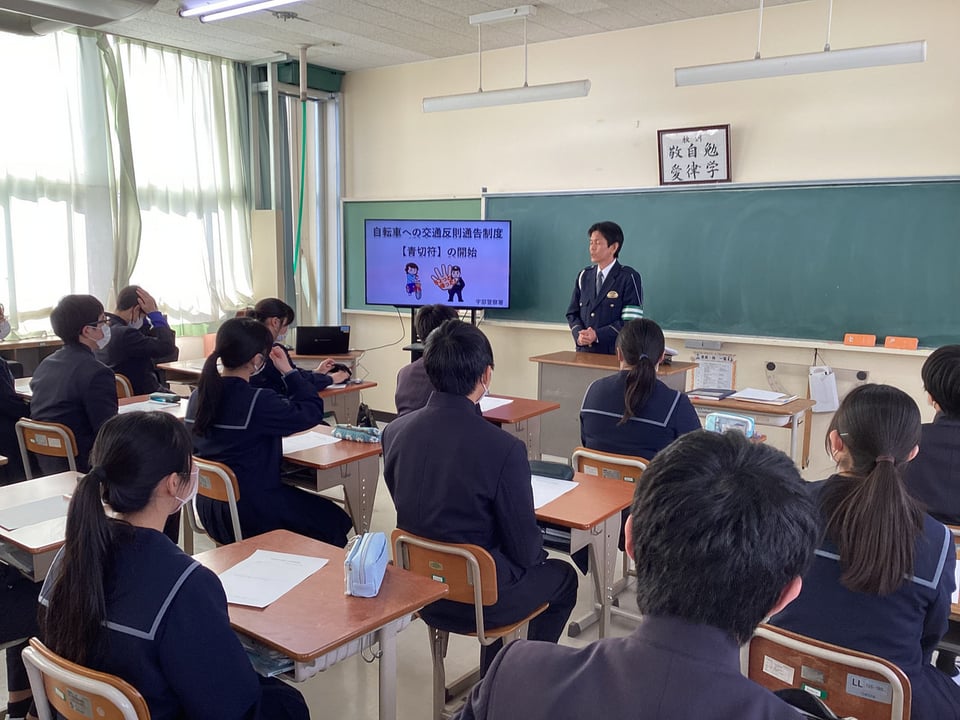 目的は楠中学校3年生に自転車への交通反則通告制度(青切符)の開始を伝えるためです。