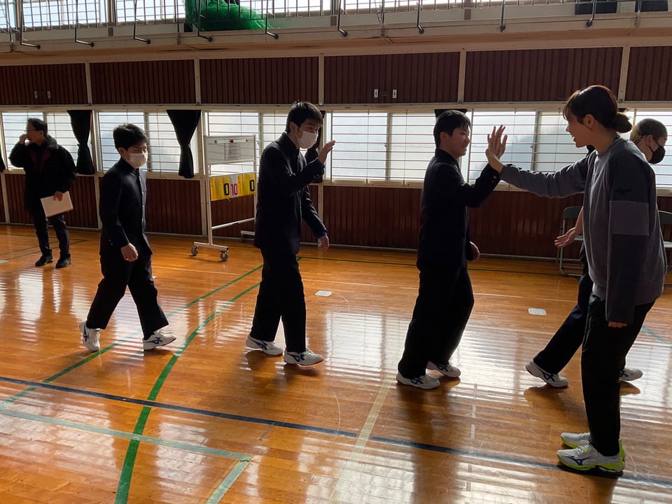 講演会の後は実技指導も行っていただきました。オーバーハンドパス、アンダーハンドパスの見本、そして基本練習、楽しい雰囲気で実技指導が進みました。最後は、バレーボール部と希望者が入ったチームでパスを30回続けることを目標にチャレンジしました。見ている楠中生は回数を数えるように迫田さんから指示があり、会場が一体となって挑みました。なかなか成功しませんでしたが、最後の最後に30回達成することができました。