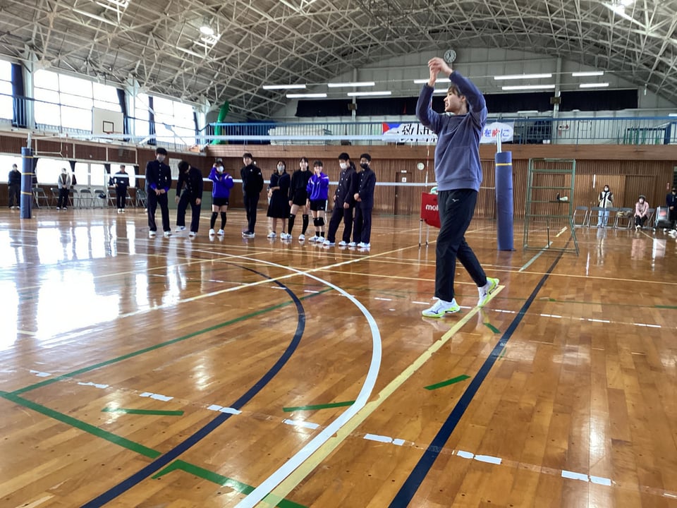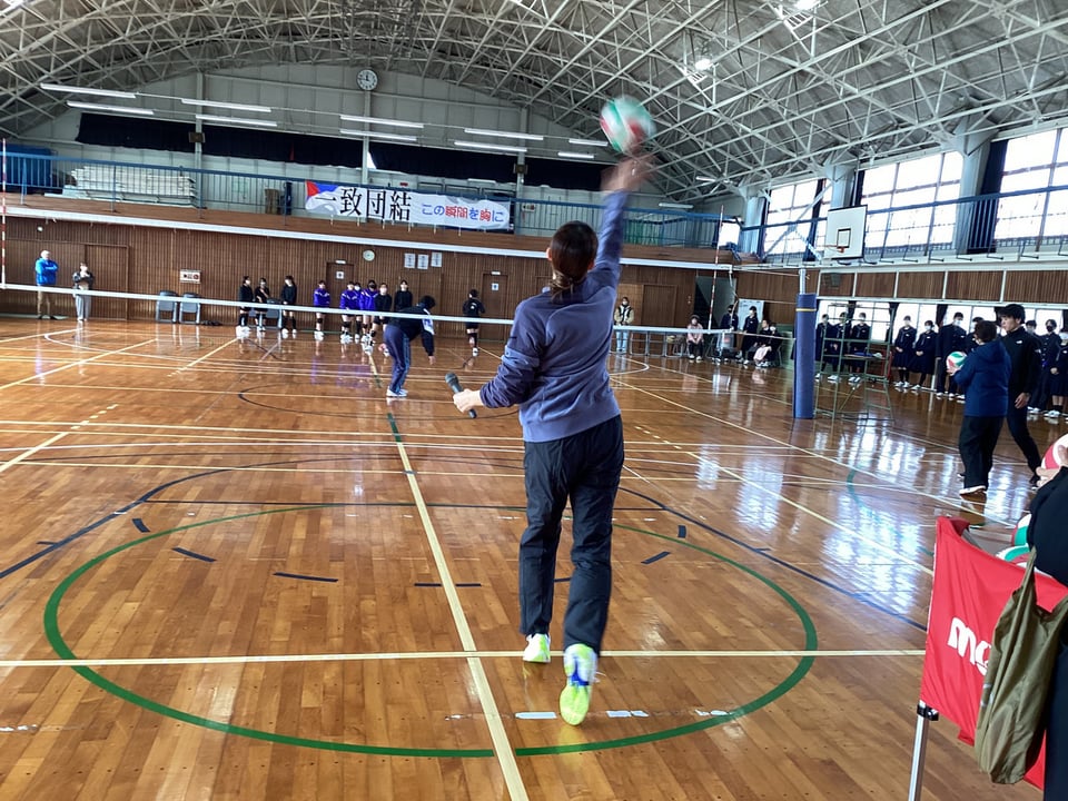 また、バレーボール部員にサーブを打ってもらい、サーブレシープの練習もさせていただきました。短い時間でしたが、迫田さんからいろいろなことを学ばせていただきました。