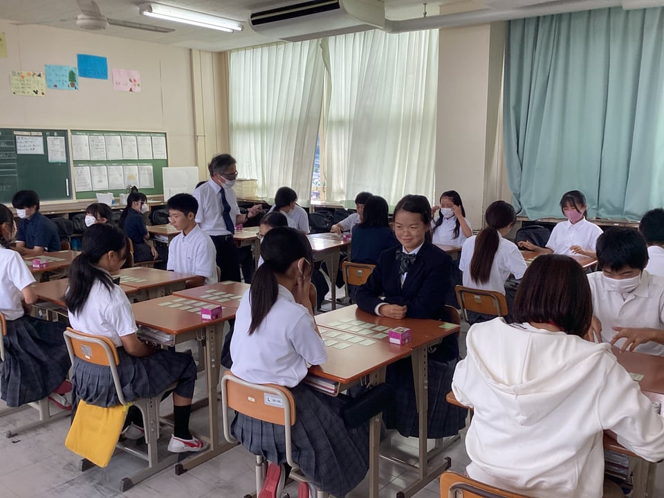 アイラ・へイスティさんが1年生と一緒に学校生活を送りました。かつて船木地区にお住まいだったようで、日本に戻られた際は船木地区に戻られようです。昨年は船木小で体験学習をされましたが、今年は同級生が中学1年になったということで、楠中で体験学習を行いました。