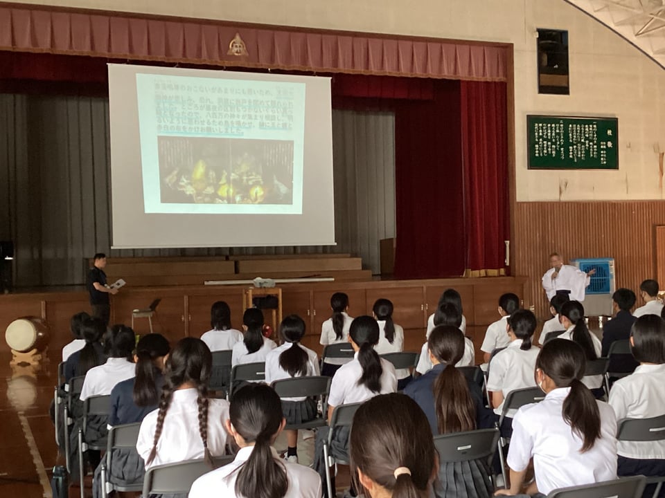 6校時の授業では神楽舞の歴史や舞の順番等を学びました。「もっと地域のことを知りたい」と思っている楠中生にとっては、地域の伝統文化について詳しく知れて、貴重な時間となりました。