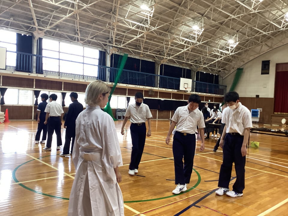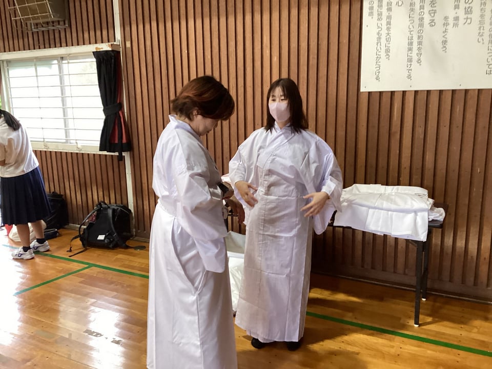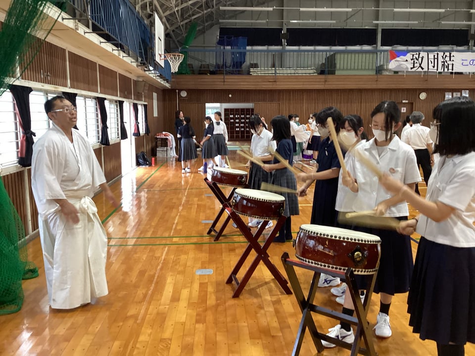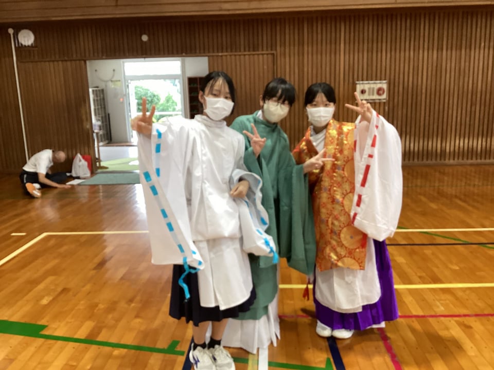 放課後の体験学習では希望者が衣装を着たり、採物の説明を受けたり、太鼓を叩いたり、舞の基本を習ったりしましたが、これまた、貴重な経験となりました。