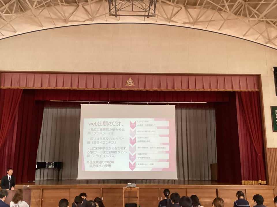 3年部からは分厚い「令和7年度 第2回 進路説明会」の冊子とプレゼン資料をもとに、進路決定までの日程、公立高等学校、国立高等専門学校、私立高等学校の入試などについて詳しく説明がありました。