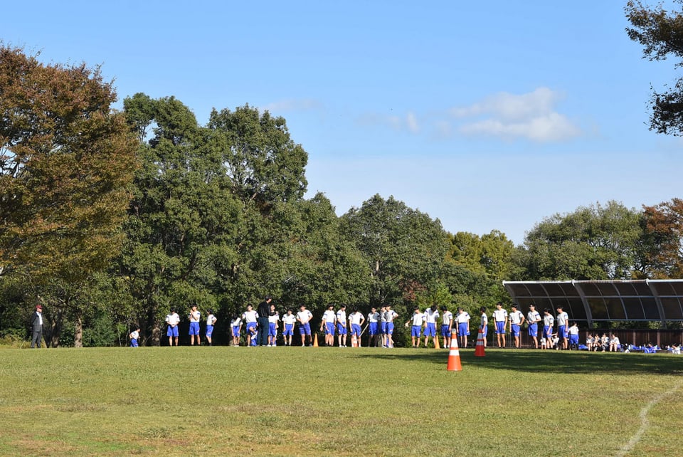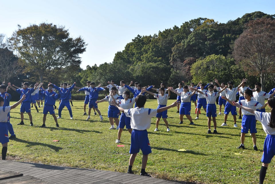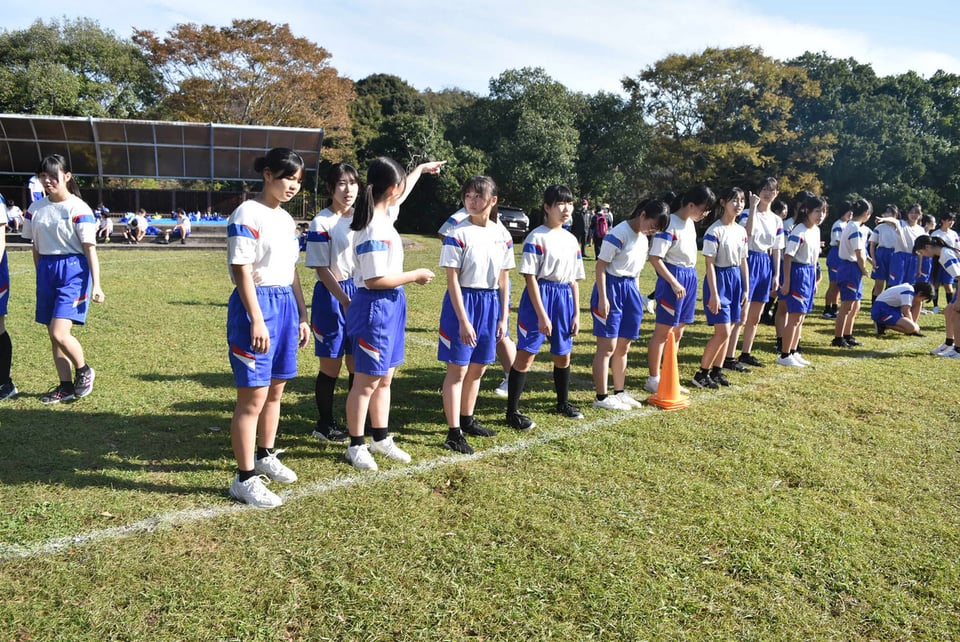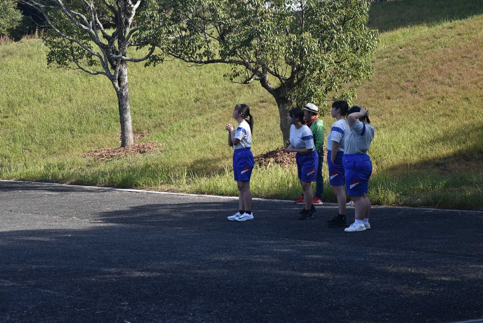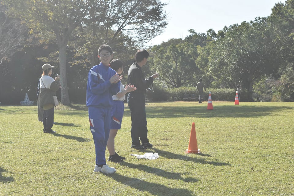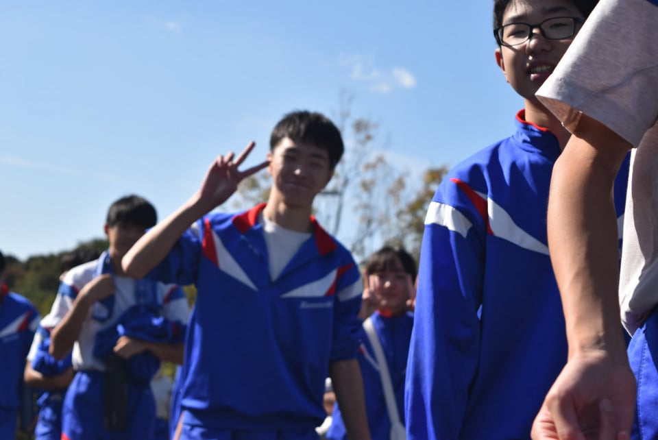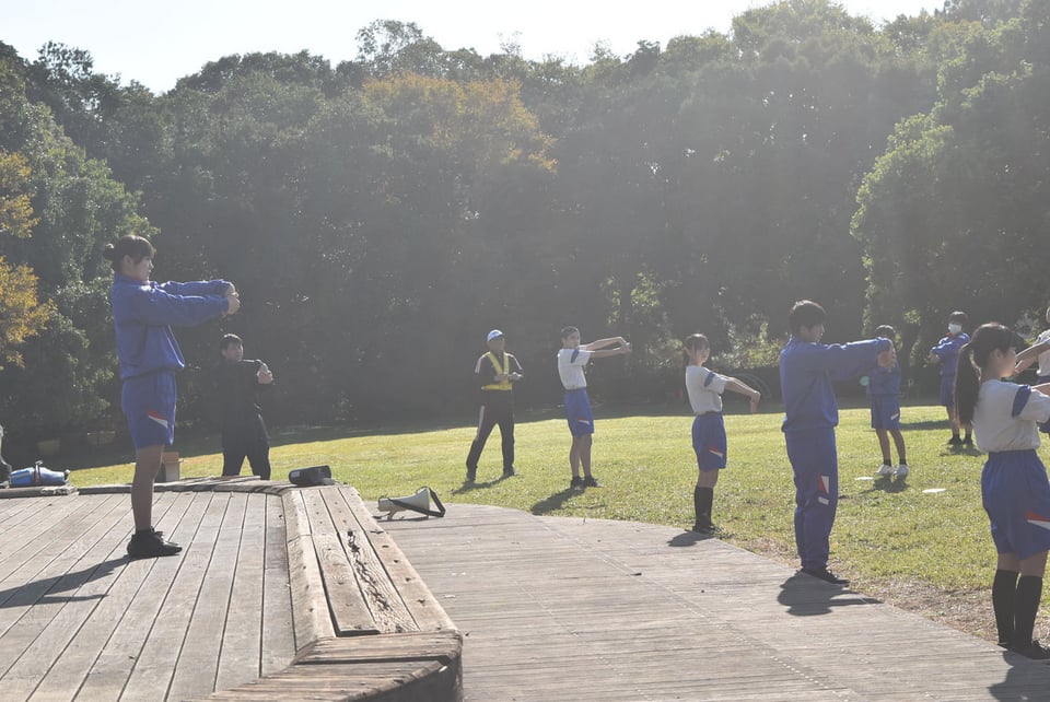 江汐公園で持久走大会を実施するため、楠中生はウォーミングアップを兼ねて江汐公園までウォーキングです。開会式では3年生の代表が「選手宣誓」を行い、全力で持久走大会に挑戦することを誓いました。保健委員長の号令のもと、準備体操を行い、「走る」という気持ちを高めていきました。