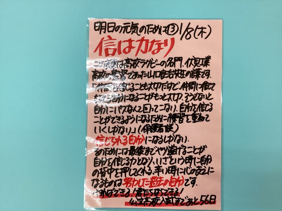 こんにちは。楠中学校です。3学期のスタートしました。新しい年を迎えると、誰もが「よし、今年はがんばるぞ」と新しい気持ちになるものです。楠中生一人ひとりが「前へ前へ」と突き進んでいこうとする気持ちで溢れているのではないでしょうか。楠中生には、今年も楠中生としての誇りと自覚、「楠中魂」をもって、元気に、笑顔で、仲良く、そして熱く、学校生活を送ってほしいと願っています。