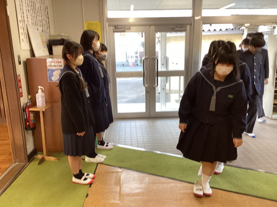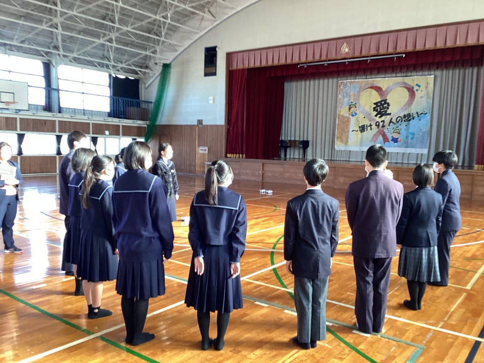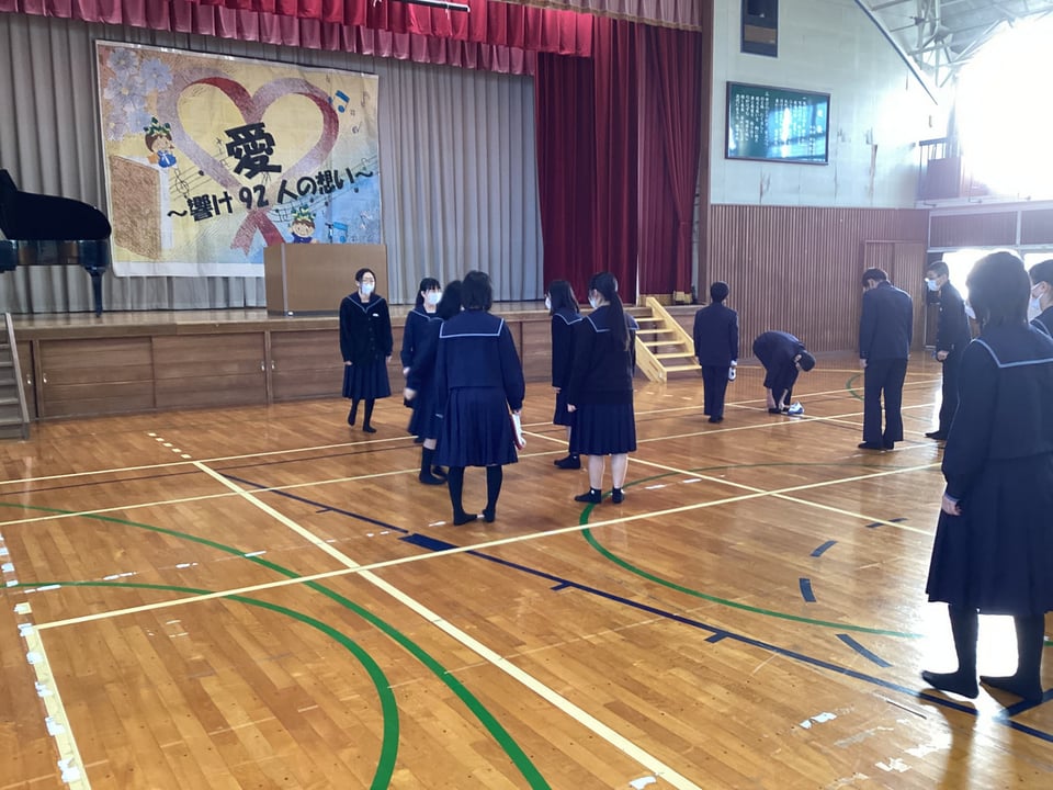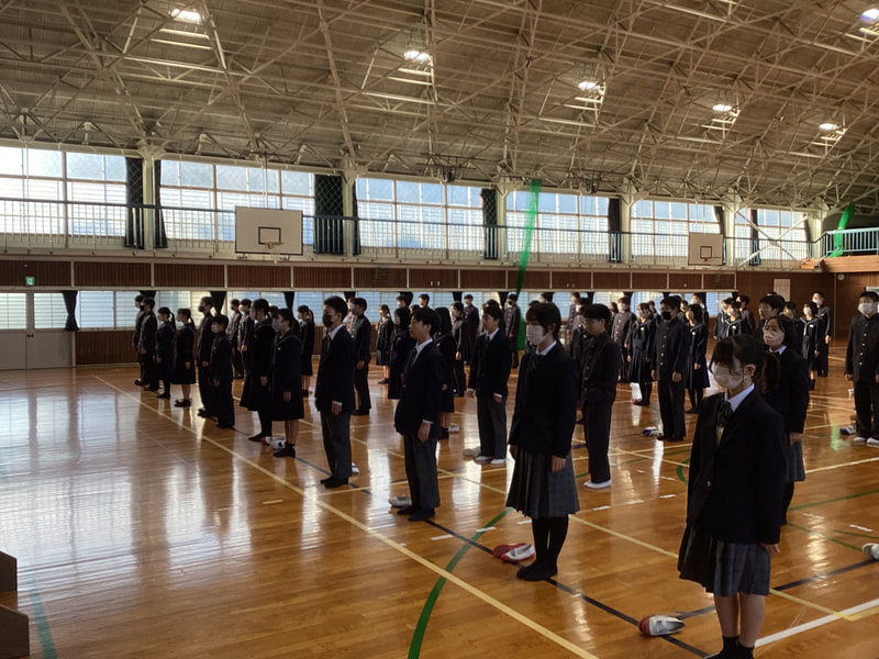 一瞬、無言であるはずの体育館がざわつきましたが、教員の一言の注意で、静寂な雰囲気になりました。楠中生のすばらしいところです。体育館の入退場を無言で行うことは楠中の「よき伝統」です。継続していきましょう。