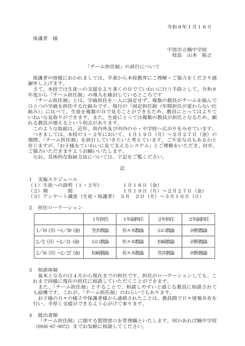 そこで、令和8年1月19日(月)~令和8年2月27日(金)をその準備期間として、「チーム担任制」を試行してみることにしました。