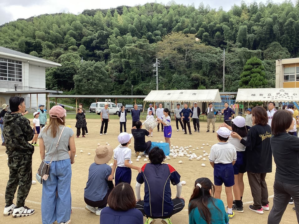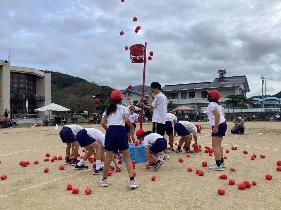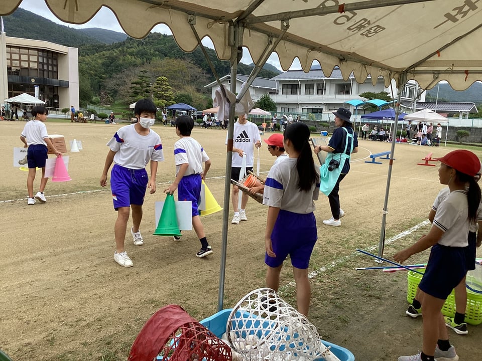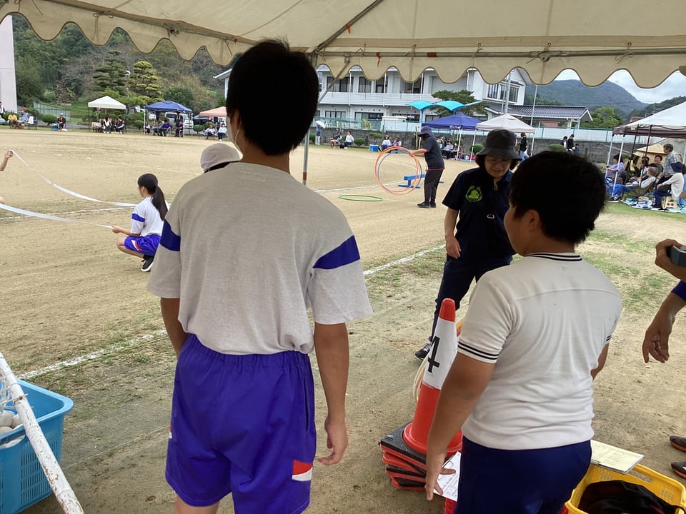 吉部小学校出身の楠中生はボランティアスタッフとして先生方や地域の方と一緒になってサポート役を見事に務めていました。競技の準備や運営を手伝ったり、150周年記念バッチを配ったり、大活躍でした。また、競技者としても障害物競走や玉入れ、大玉転がしなどに出場し、場を盛り上げていました。私は最後まで参加することができなかったため、見ることはできませんでしたが、150周年記念として「空高く舞え 吉部の夢【風船飛ばし】」があったと聞いています。吉部地区に住んでおられる人々の心がひとつになったのではないでしょうか。吉部小学校の児童の一生懸命な姿を楠中生、保護者、地域住民が心から応援し、吉部地区全体で楽しむ心温まるすてきな運動会でした。