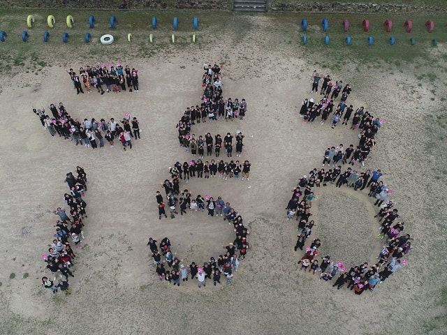 最後に、運動場から児童遊園に移動し、創立150周年を記念して、小学生・中学生・教職員・保護者・地域の方々による人文字を作り、上空から撮影しました。本校児童にとってはもちろんのこと、厚東地区にとっても、とてもいい思い出となりました。