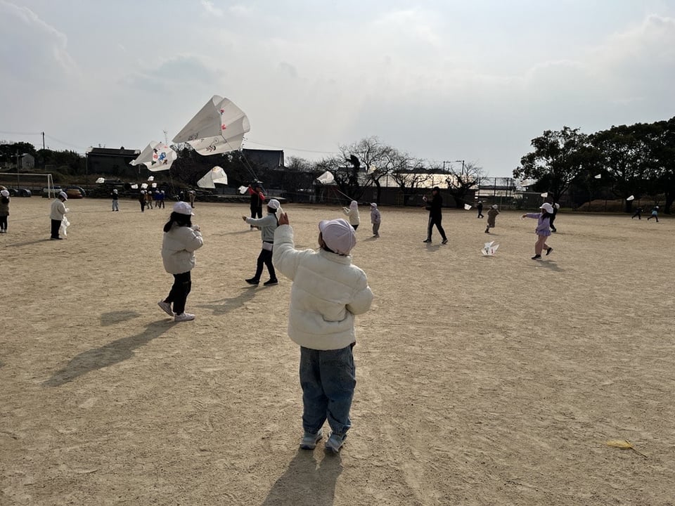 〇子どもたちは、自分たちのオリジナル凧が空高く舞い上がる様子に大喜び。グラウンドには、楽しそうな笑い声が響き渡っていました。