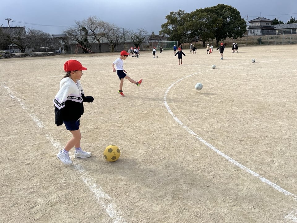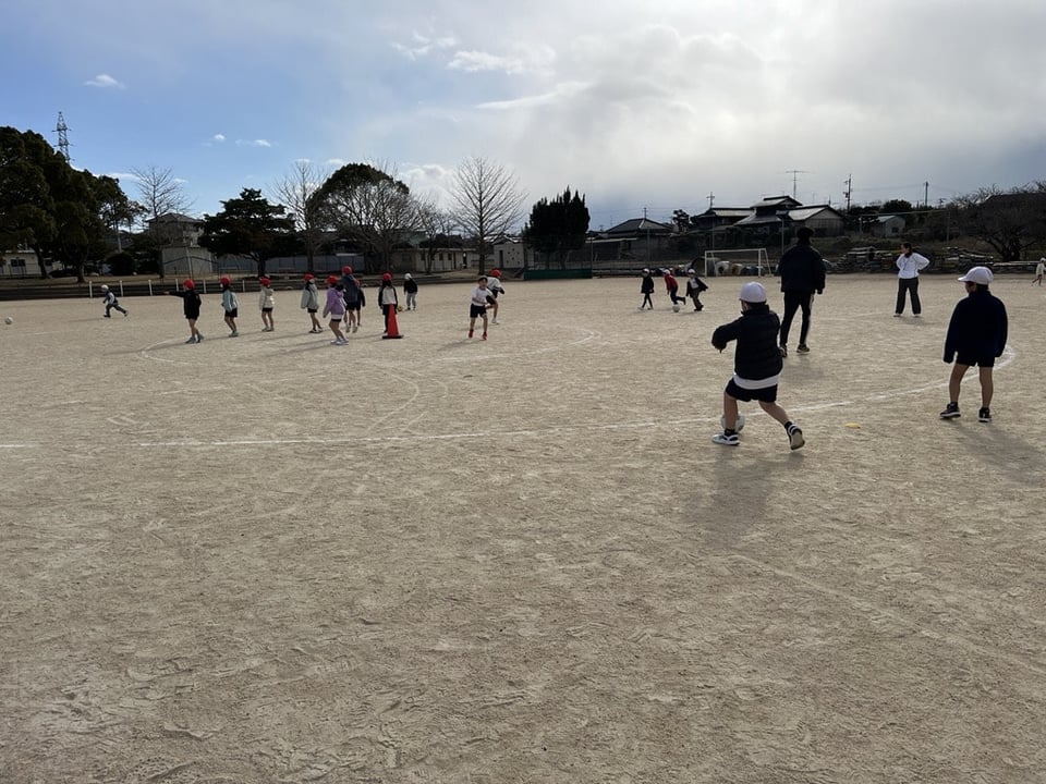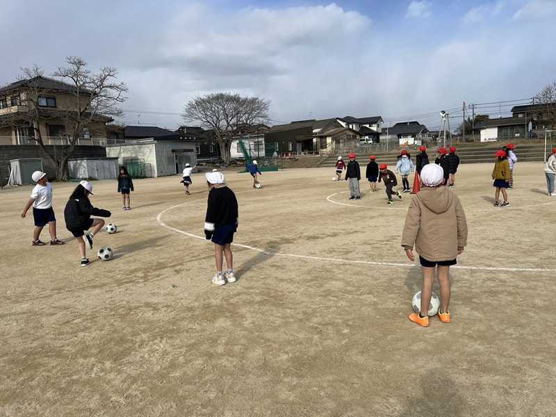 〇グラウンドでは、2年生の合同体育「ボール蹴り遊び」が行われています。