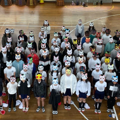 〇図工の授業(3時間)で狐の面づくりをしました。〇完成したお面をかぶってみんなでお披露目です。〇個性豊かなお面が勢ぞろい…
