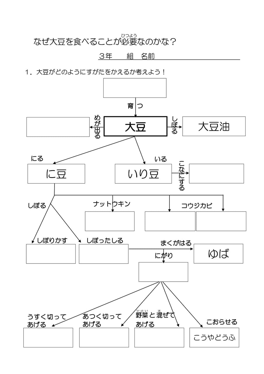 ③給食を食べながら、姿をかえた大豆を探す(担任・栄養教諭)。