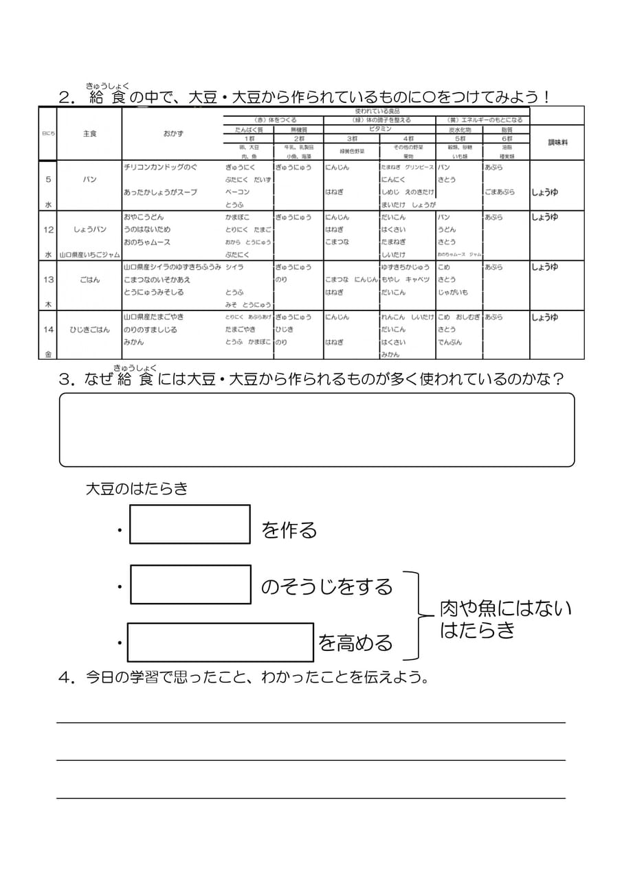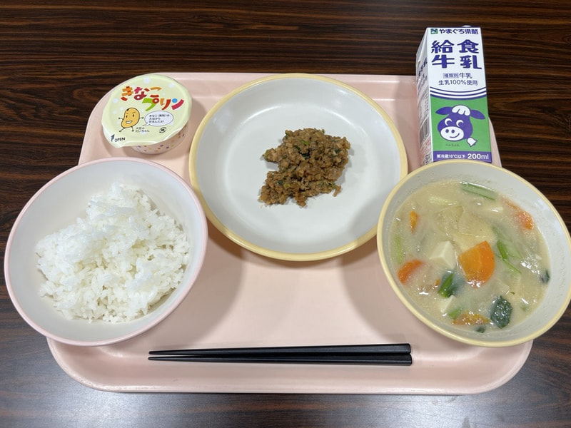 〇本日の給食です。このメニューの中には、姿をかえた大豆が6種類入っています。