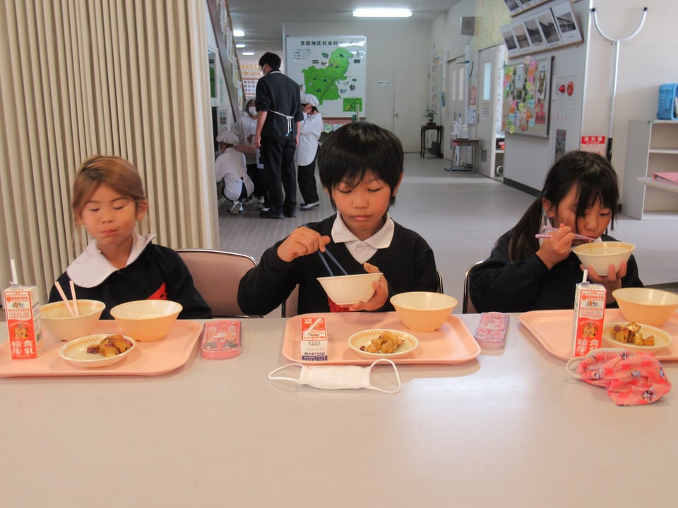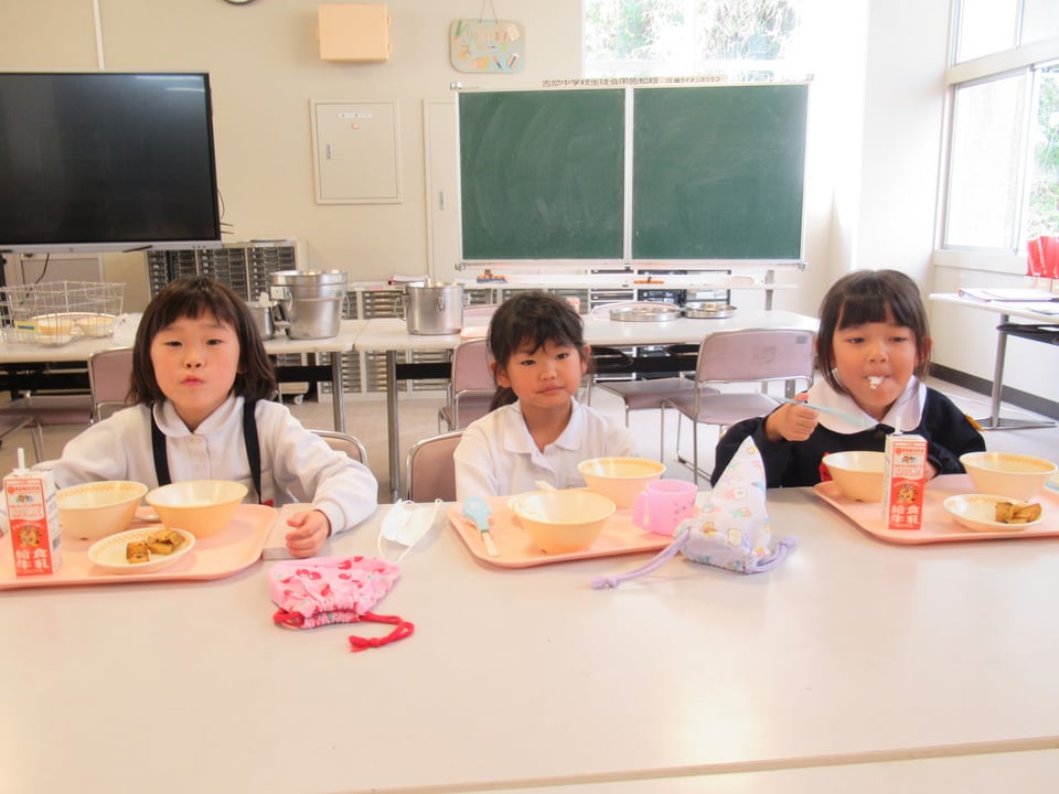 そのあと、1・2年生みんなで給食を食べ、楽しいひとときを過ごしました。