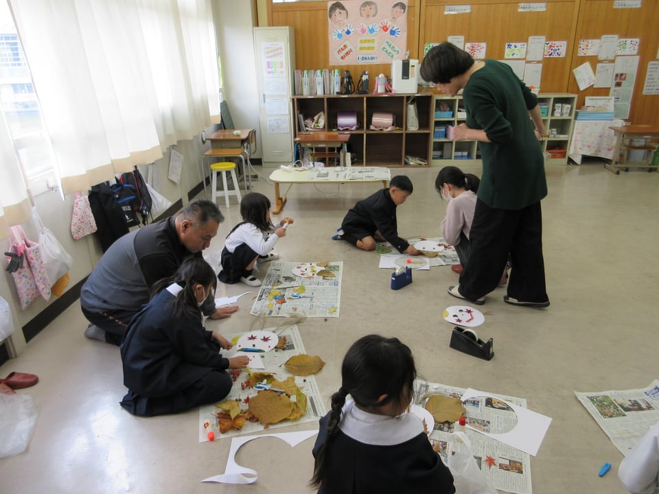 自己紹介の後、校外に出て いろいろな形・色の落ち葉や木の実を集めて お面づくりに取り組みました。