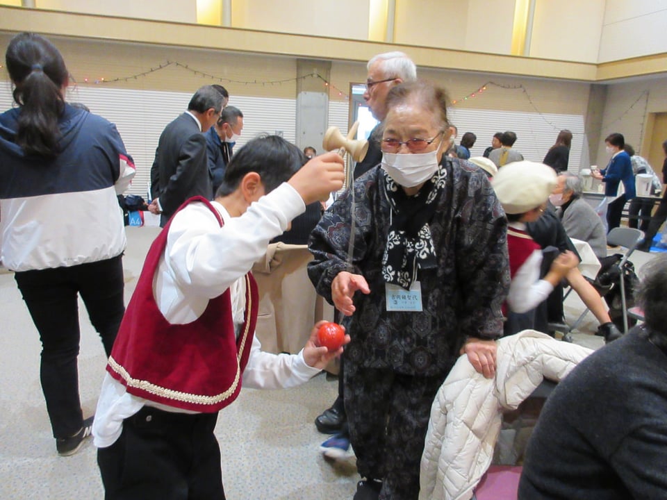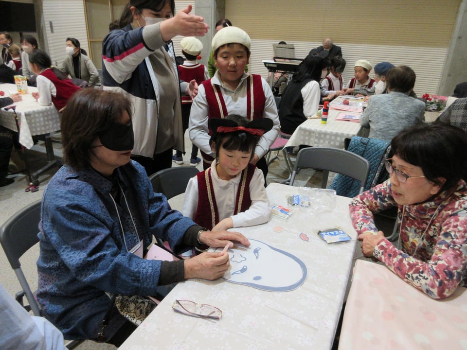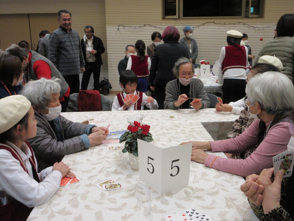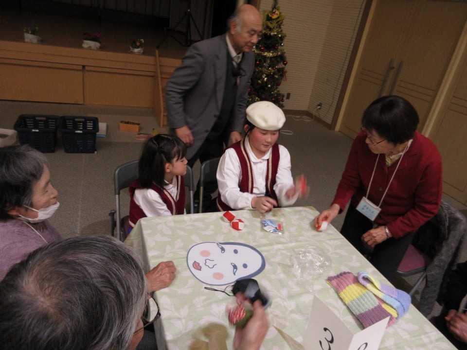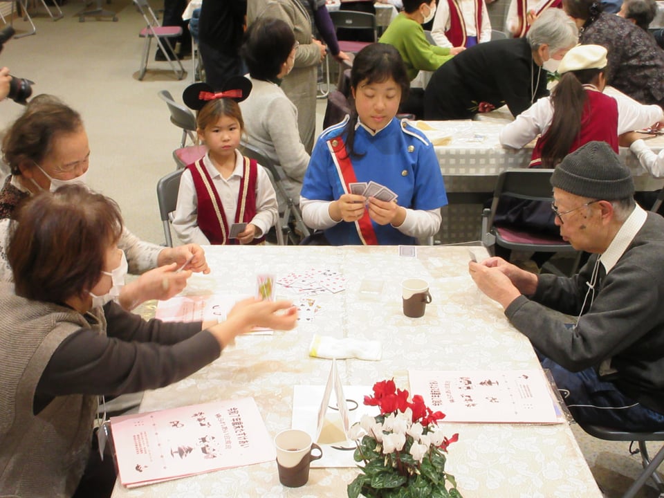 まず、ステージでマーチング発表をし、その後、グループに分かれて、クイズ大会をしました。また、そのグループで 福笑いやおはじき、お手玉、ダルマ落とし等の昔の遊びやトランプゲームをし、和やかに過ごしました。