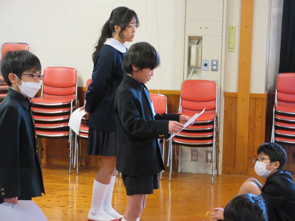 始業式では、学年代表の児童が「新年のちかい」を発表しました。漢字をがんばって勉強する、マーチングの練習をがんばる、算数の学習をがんばる、学年がひとつ上がるから いろいろ挑戦する…等、各自の努力目標を力強く述べていました。また、6年生は、卒業後の進学という大きな節目を迎えることから、中学校への意気込みを語りました。