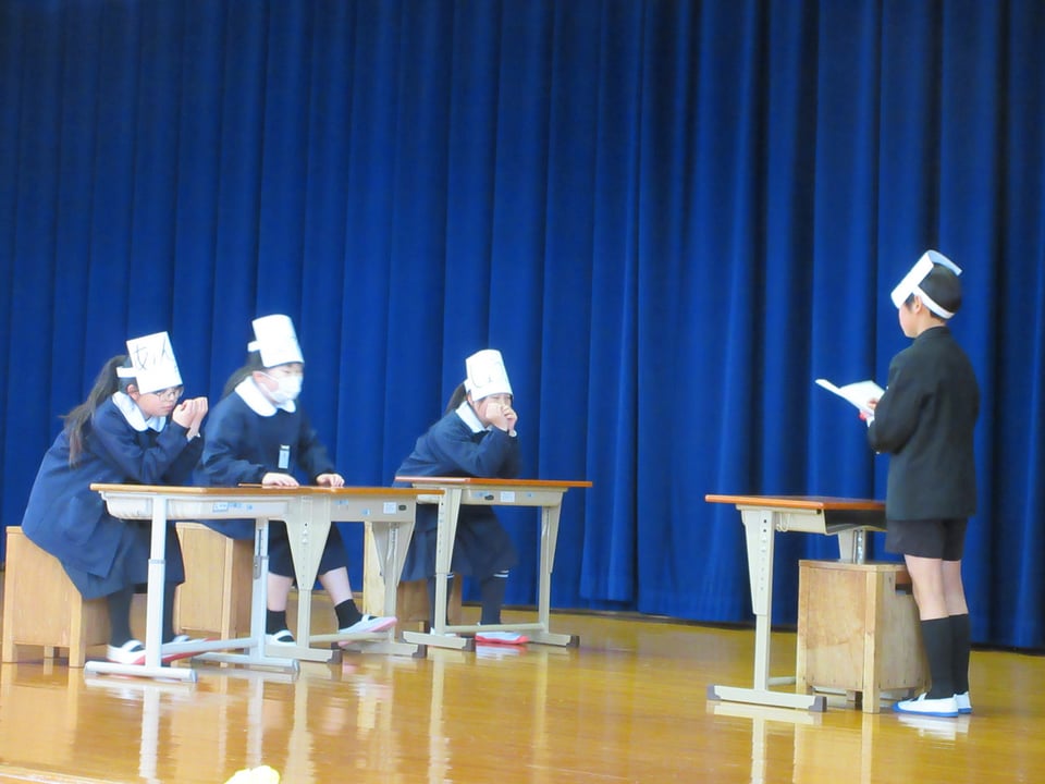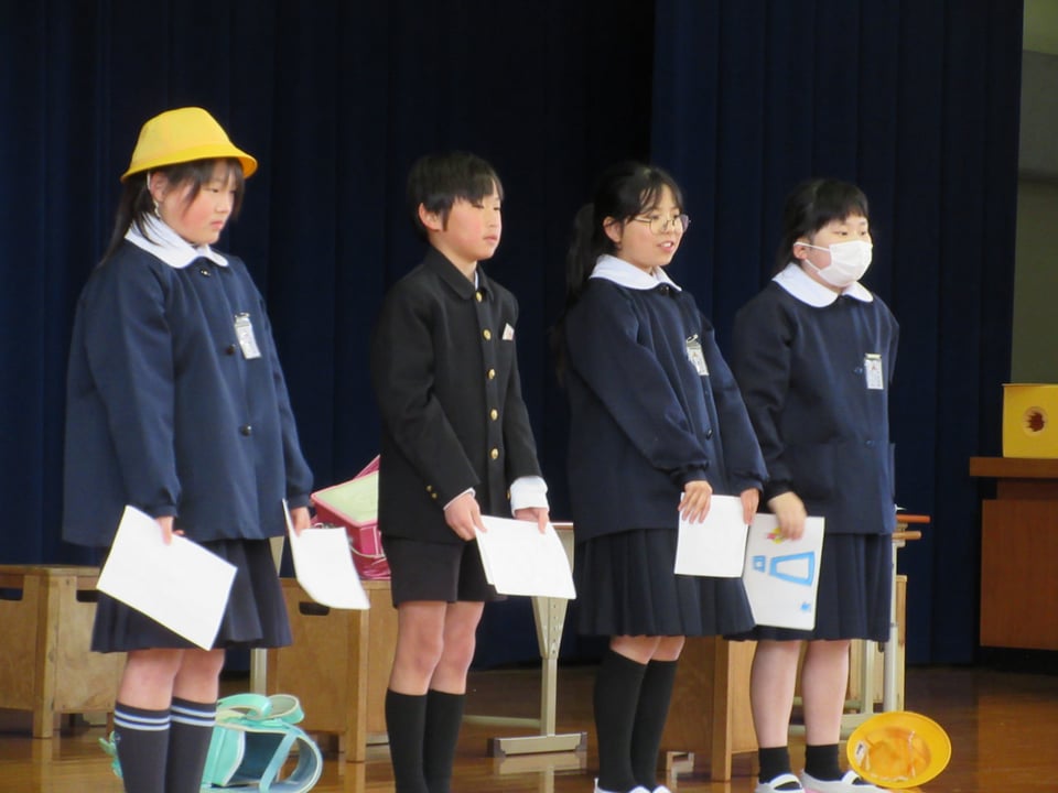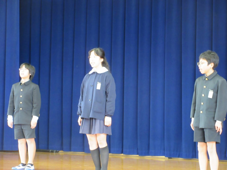 6年生は宮沢賢治の詩『雨ニモ負ケズ』の暗唱を披露し、最後に後輩たちへお礼の言葉やメッセージを述べました。