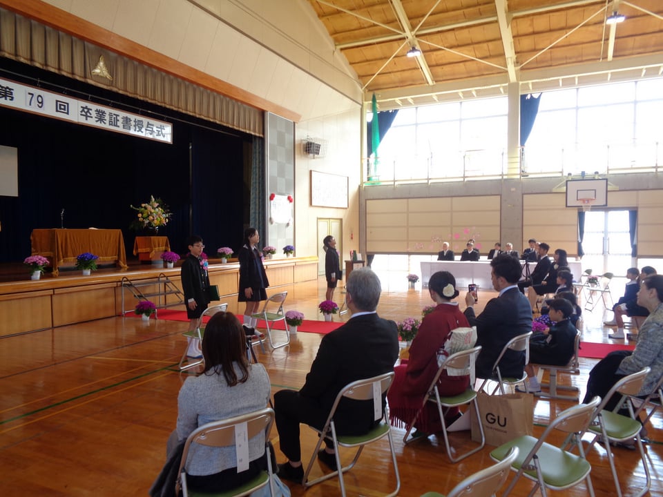 春らしい穏やかな日差しと、冬の名残を感じさせる風が舞う この日、第79回卒業証書授与式が行われました。校長や来賓からお祝いの言葉が寄せられた後、卒業生が6年間の思い出を振り返り、それぞれの夢や希望を堂々と述べました。また、在校生が巣立ちゆく先輩たちに温かいメッセージを送りました。