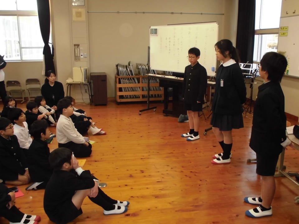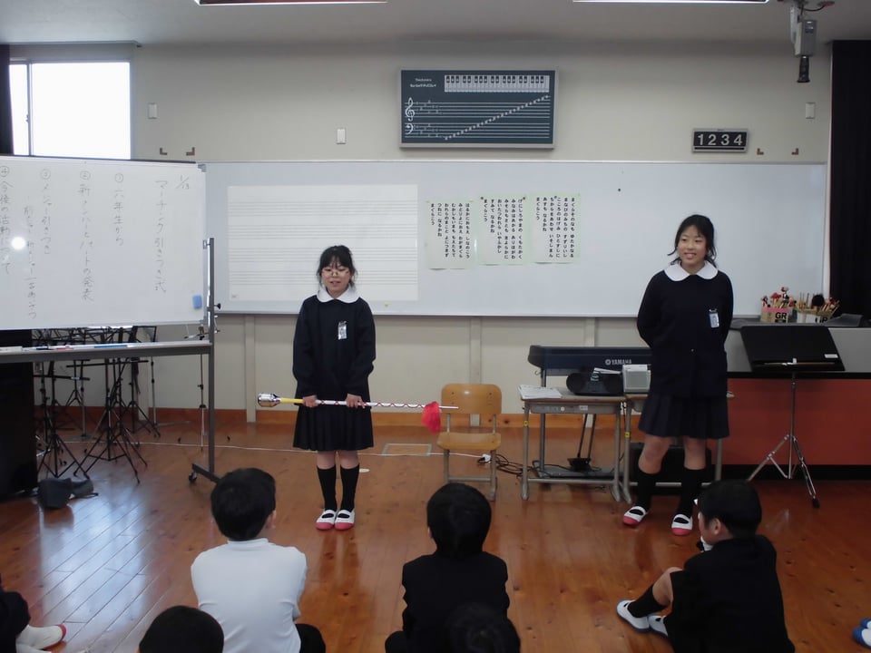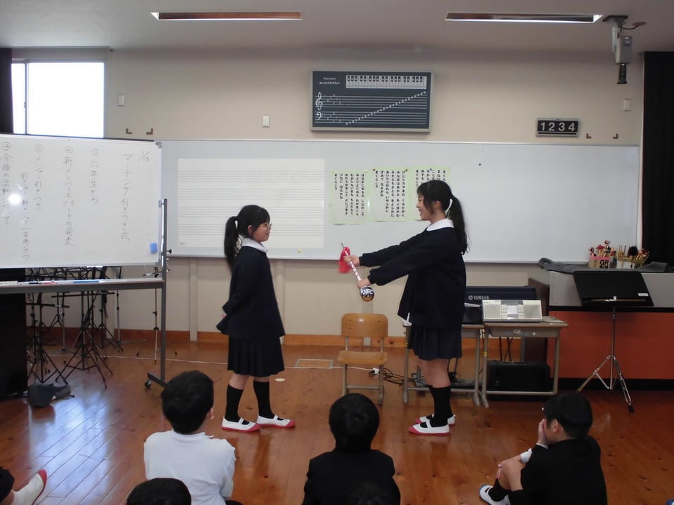 はじめに、6年生から1人ずつメッセージを述べてもらいました。今日までの活動を振り返っての感想を述べる児童や、後輩たちへ「頑張って練習してください」「地域の人たちを笑顔にしてください」等、志を引き継いでほしいという思いを述べる児童もいました。その後、新旧のメジャーによるバトンの受け渡し、新しく担当する楽器の発表……と続き、引継式は終わりました。