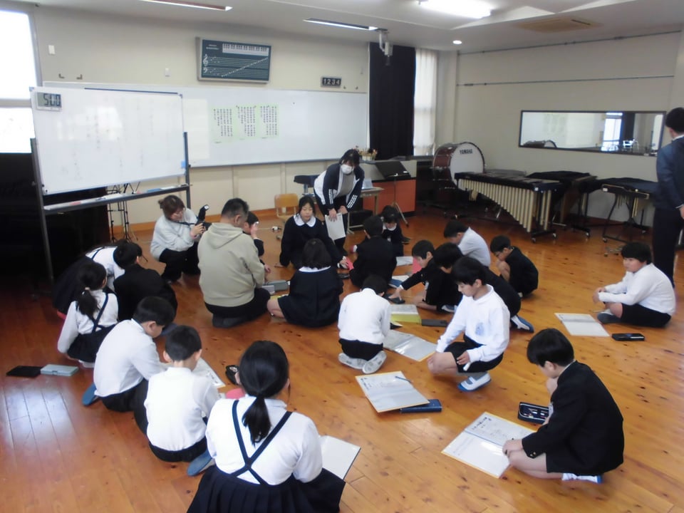 1月13日(火)5校時、本校の音楽室でマーチング引継式を行いました。