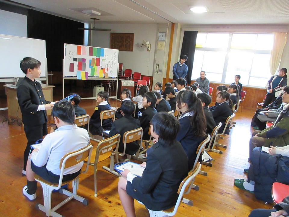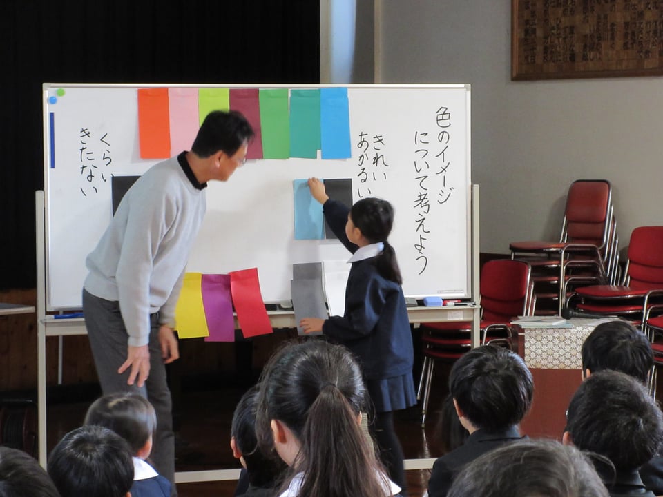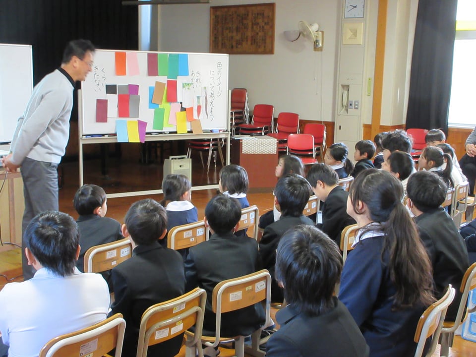 1月22日(木)、万倉小学校の多目的スペースを会場として「子どもと大人の人権学習会」が開かれました。万倉地区人権教育推進協議会の 山本 一光 会長 様による「色のイメージからつながる差別意識」についての授業を 万倉小の児童が受けました。